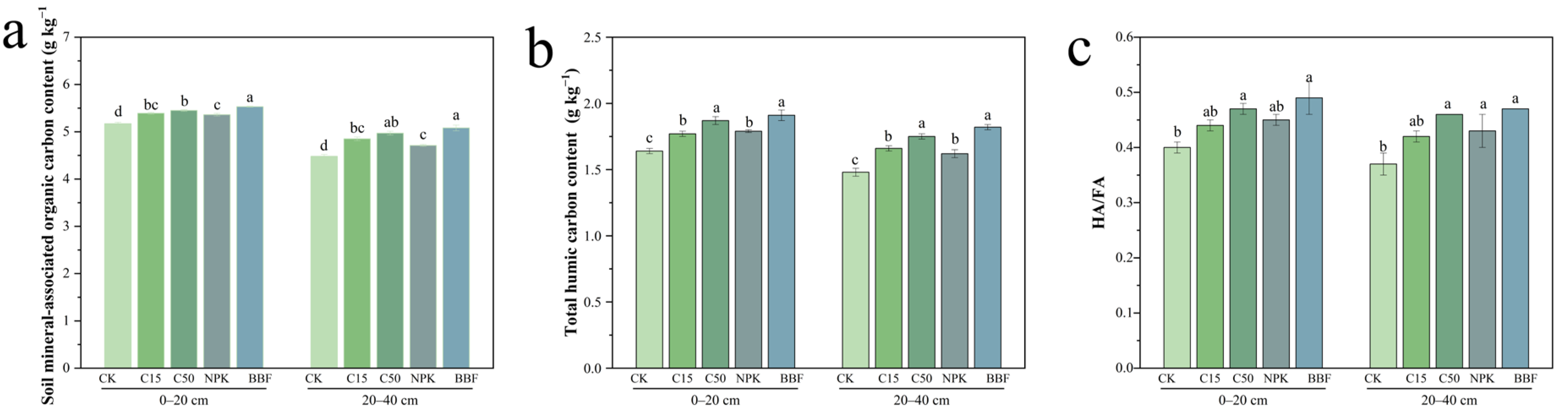 | 0–20 | CK | 0.23 ± 0.01 c | 0.07 ± 0.00 c | 0.22 ± 0.02 a | 0.52 ± 0.05 a |
