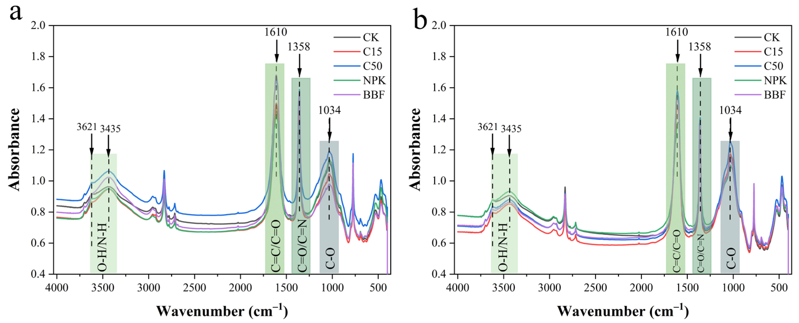 | Soil Layer (cm) | Treatments | C=C/C=O 1610 cm−1 | C=O/C=N 1358 cm−1 | C-O 1034 cm−1 | O-H/N-H 3621 + 3435 cm−1 |