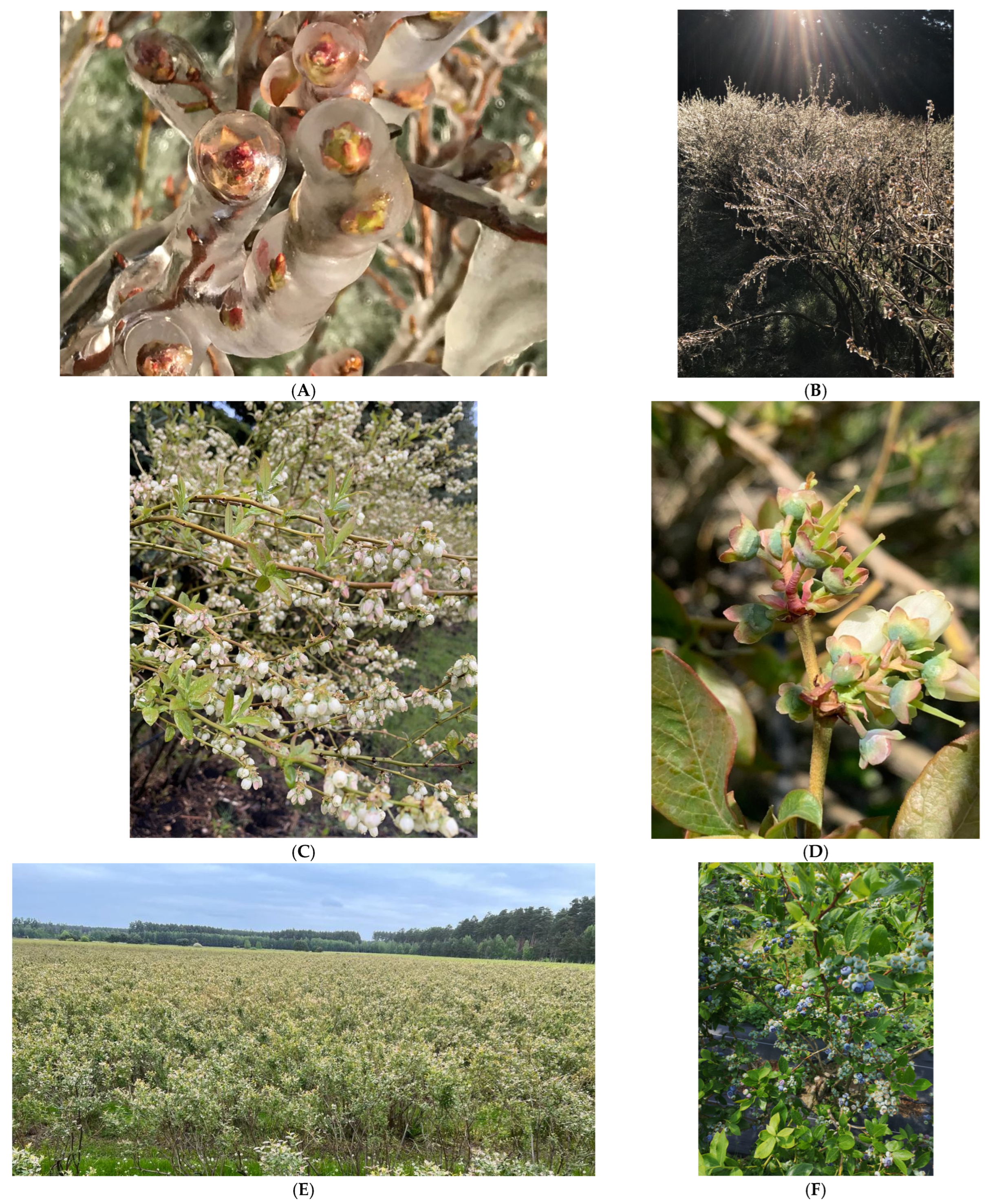 The bushes were established in 2012. The experiment included four highbush blueberry cultivars: ‘Sunrise’, ‘Draper’, ‘Ozark Blue’, and ‘Aurora’. ‘Sunrise’ (NC, USA) is an early- to mid-season cultivar producing large, light-blue fruits with good firmness and mild flavour, well suited for the fresh market (