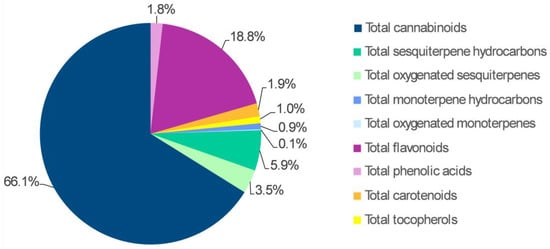 Average abundance of the different phytochemical classes in the inflorescences of hemp plants from the cv. Codimono. The percentage of each metabolite class was calculated relative to the total sum of all the metabolite classes.