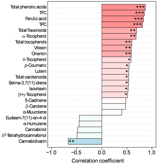 TAA, evaluated as scavenging activity of the ABTS radical, ranged between 49.18 and 61.90 μmol TE g−1 DW (Figure 2). Correlation analysis revealed that TAA was strongly positively correlated with total phenolic acids, ferulic acid, TPC, and TFC (Figure 3). A highly positive correlation was also observed with total flavonoids, total tocopherols, α-tocopherol, vitexin, and orientin, while a moderate positive correlation was detected with δ-tocopherol, p-coumaric acid, lutein, total carotenoids, selina-3,7(11)-diene, isovitexin, and β + γ-tocopherol (Figure 3). TAA was also negatively correlated with cannabidivarin (Figure 3). These results confirmed our previous findings on the same cultivar, which highlighted a high positive correlation between TAA evaluated through the ABTS assay and TPC, TFC, and phytochemicals belonging to the classes of phenolic compounds and tocopherols, especially vitexin, orientin, and α-tocopherols [17]. Other hemp cultivars have also shown a dominant role as antioxidants for these classes of compounds [11]. This is in line with the well-established antioxidant role of these compounds. Due to the presence of hydroxyl groups, phenolic compounds function well in aqueous environments by donating hydrogen atoms or electrons to stabilize reactive oxygen species, while the lipid-soluble tocopherols use hydrogen donation to quench lipid peroxyl radicals. Both neutralize free radicals, thereby protecting plant cells from oxidative damage [37]. Regarding the negative correlation of TAA with some cannabinoids, especially cannabidivarin, this does not necessarily mean that they are pro-oxidants per se, but rather that in the composition of the analyzed extract, a decrease in these cannabinoids occurs together with an increase in TAA linked to the increase in other dominant antioxidants such as phenolic compounds and tocopherols (see Section 3.2). Collectively, these findings contribute to the growing body of literature demonstrating the antioxidant potential of hemp inflorescences [11,38,39,40], a key factor underlying the health-promoting properties associated with their rich phytochemical composition.