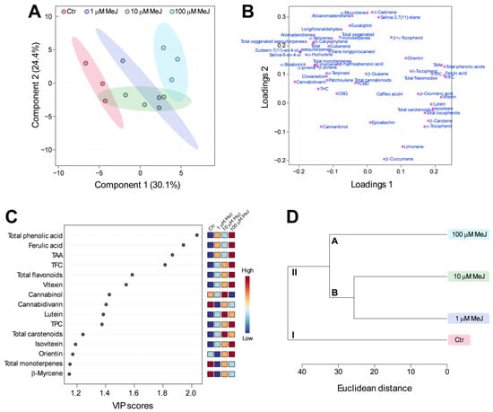 To identify significant metabolites differentiating control from MeJ treatments, multivariate analysis was carried out on the entire dataset (Figure 4). As shown in Figure 4A, the partial least squares discriminant analysis (PLS-DA) score plot showed a clear separation between treatments. The differences were evident mainly in the Component 1 direction, with control positioned on the negative side of the Component 1 axis and MeJ treatments positioned on the positive side (Figure 4A). The greatest separation was observed between control and 100 μM MeJ treatment, followed by 1 and 10 μM MeJ treatments, which partially overlapped with each other (Figure 4A). Consistent with the distribution of metabolites observed in the different treatments, TPC, TFC, TAA, total phenolic compounds, total carotenoids, total tocopherols, and individual metabolites belonging to these classes were located on the right side of the loadings plot, while total cannabinoids, total terpenes, and individual cannabinoids and terpenes were located on the left side (Figure 4B). Moving on to the variable importance in projection (VIP) score plot (Figure 4C), it highlighted the top fifteen significant metabolites having VIP values greater than one, which indicated that these metabolites were the top contributors in the separation of treatments [49]. High-VIP metabolites included total phenolic acids, flavonoids, and carotenoids, ferulic acid, vitexin, isovitexin, orientin, lutein, and TAA, which, as already shown by ANOVA, were present at the highest levels in the 100 μM MeJ treatment and at the lowest levels in the control. The list of high-VIP metabolites also included the less abundant cannabinol, cannabidivarin, total monoterpenes, and β-myrcene, which instead showed the highest levels in the control (Figure 4C).