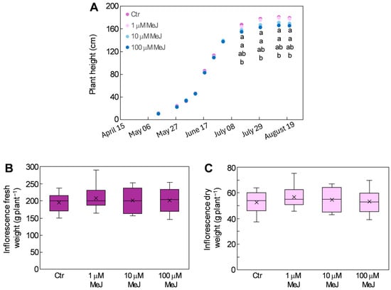 Compared to control plants, MeJ-treated plants only slightly decreased in height over the course of treatment; the decrease was significant only in plants treated with 100 μM MeJ, where it did not exceed 8% (Figure 5A). A slight but not significant increase in fresh and dry weight of the inflorescences was observed in MeJ-treated plants compared to the control, which ranged from 3.3% to 6.9% for fresh weight (Figure 5B) and from 1.8% and 8.2% for dry weight (Figure 5C).
