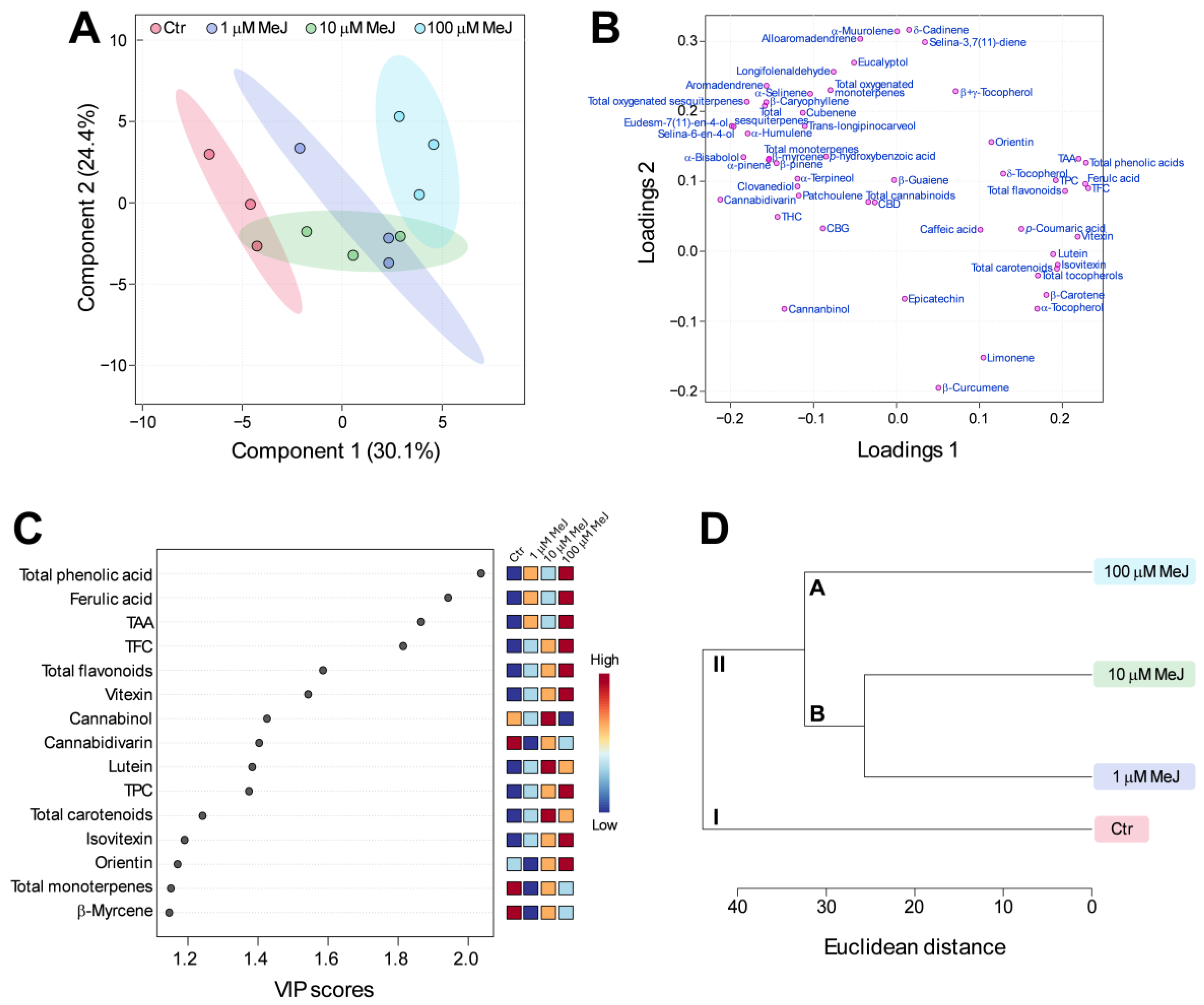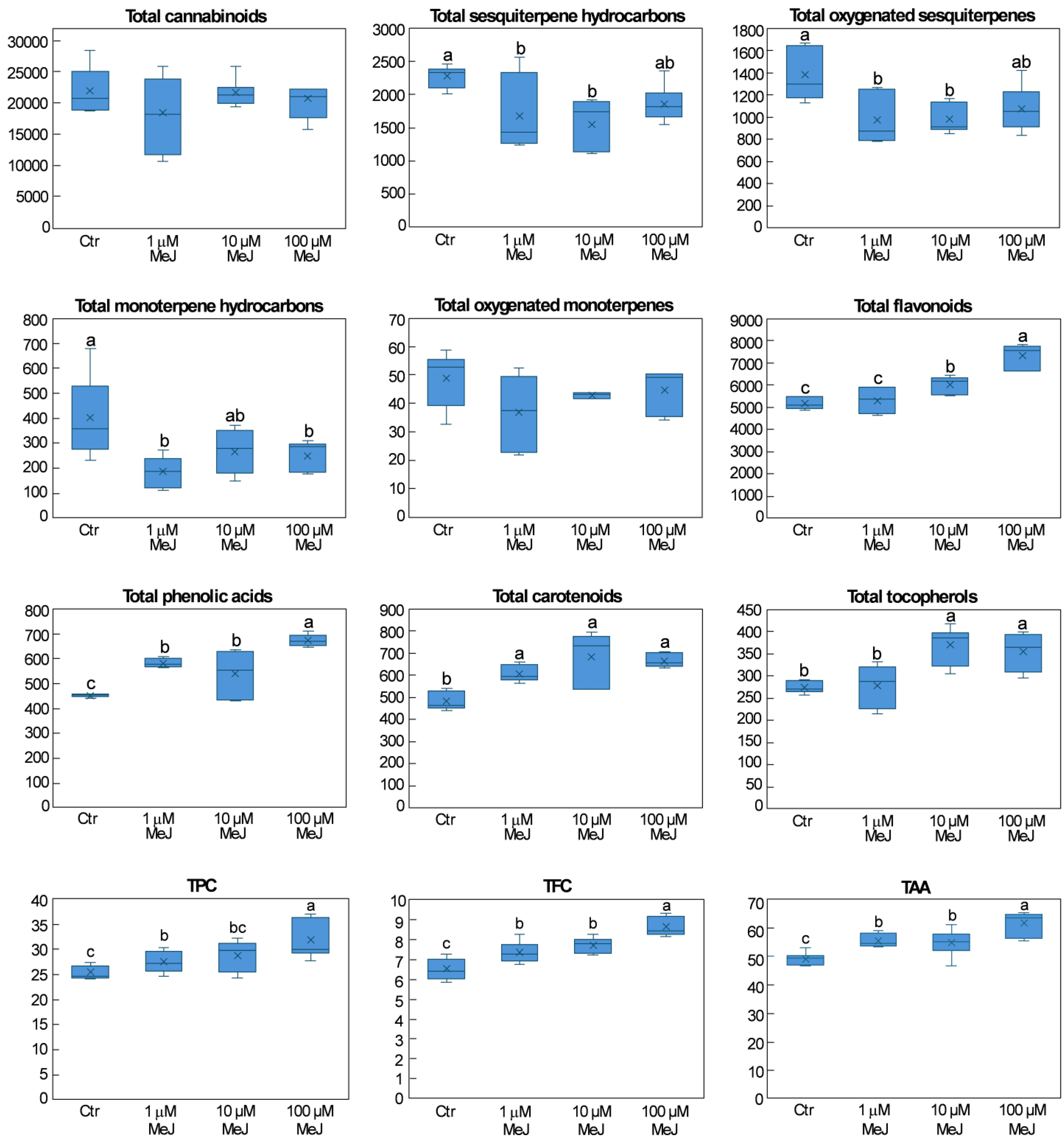 3.2. Effect of MeJ Treatments on the Phytochemical Content and the Total Antioxidant Activity of Hemp Inflorescences