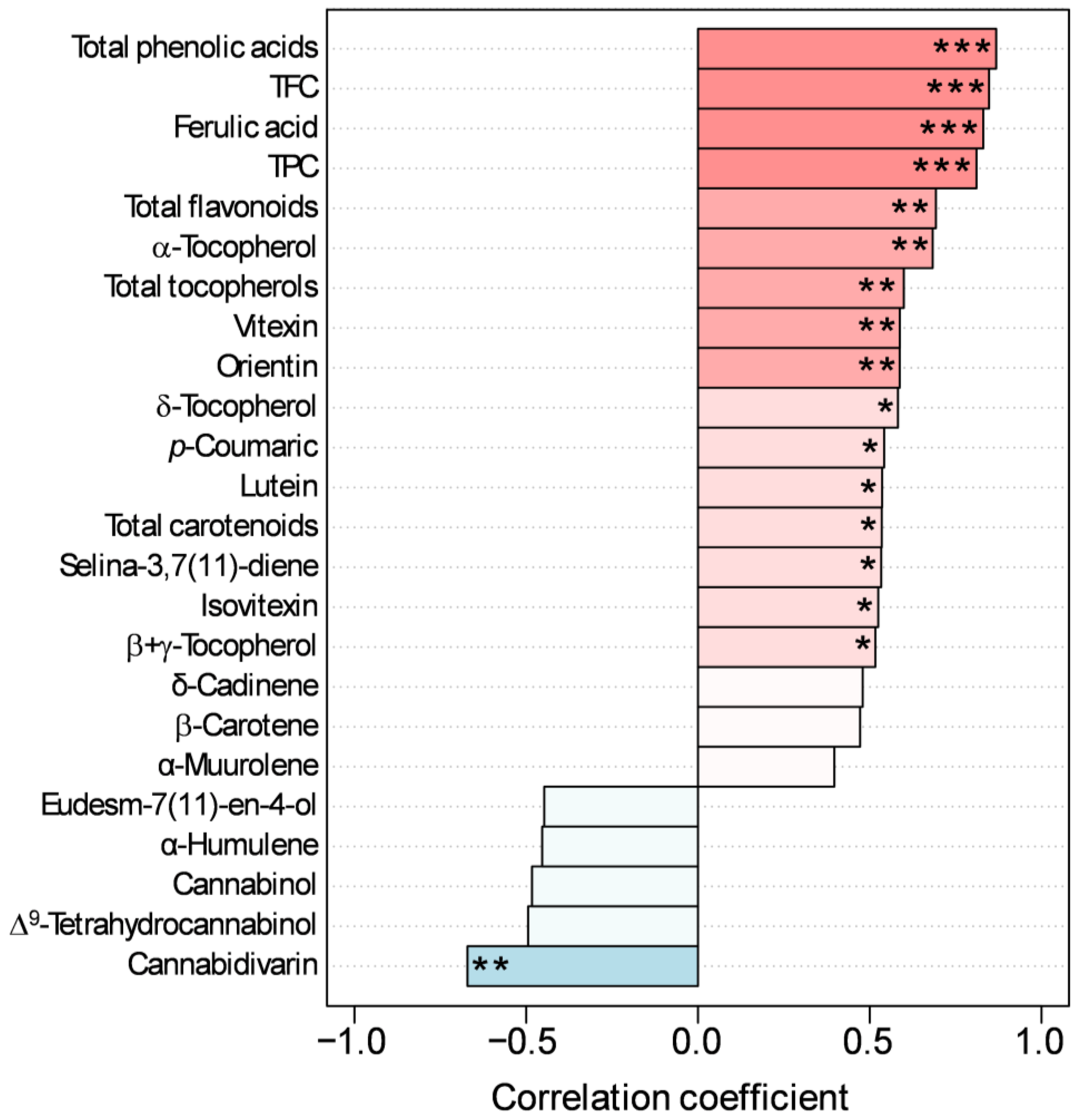 - Beleggia, R.; Menga, V.; Fulvio, F.; Fares, C.; Trono, D. Effect of genotype, year, and their interaction on the accumulation of bioactive compounds and the antioxidant activity in industrial hemp (Cannabis sativa L.) inflorescences. Int. J. Mol. Sci. 2023, 24, 8969. [Google Scholar] [CrossRef]