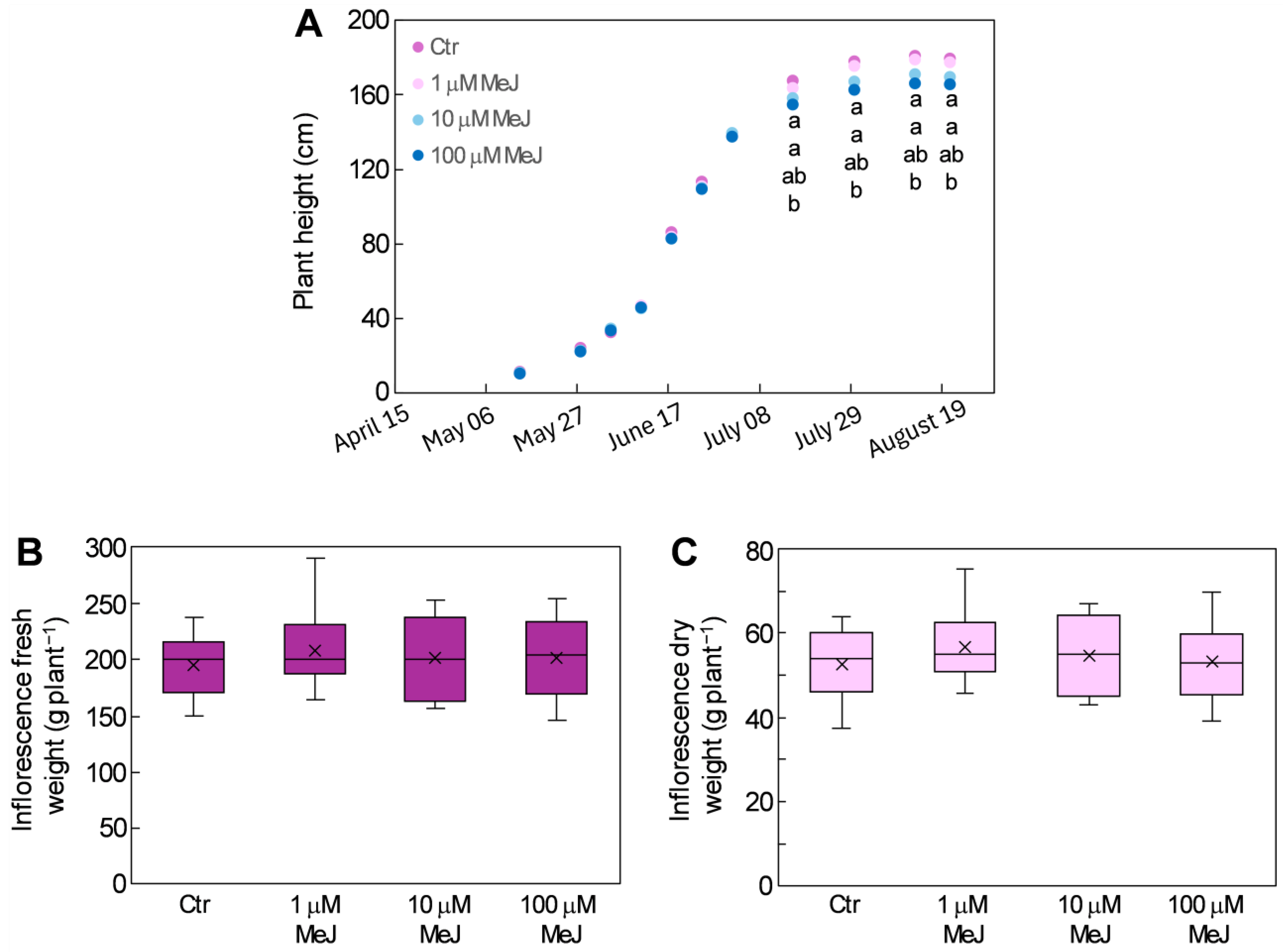 3.4. Effect of MeJ Treatments on Plant Growth and Inflorescence Biomass