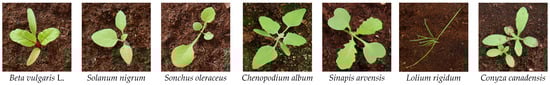 A total of 150 seeds of red or red beet (Beta vulgaris L., Conditiva Group, cv. Kestrel F1) (Figure 1) were sown in substrate placed on raised beds. The plants were kept in the trial until the end of the vegetative period (40 days after sowing), a critical stage in beet cultivation. During this early stage, seedlings exhibit slow growth and limited canopy cover, making them highly susceptible to competition from weeds, which tend to emerge and develop more rapidly [30]. Under these conditions, if timely management is not implemented, young beet plants may be overgrown by weeds, compromising both crop establishment and potential yield [31]. Six weed species were established: Solanum nigrum, Sonchus oleraceus, Lolium rigidum, Chenopodium album, Conyza canadensis, and Sinapis arvensis (Figure 1).