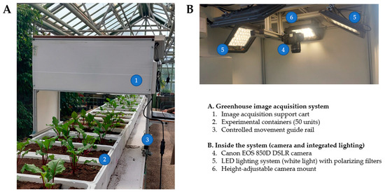 Support cart for image acquisition in red beet cultivation. (A) Overview of the acquisition system. (B) Interior view showing the camera and integrated lighting.