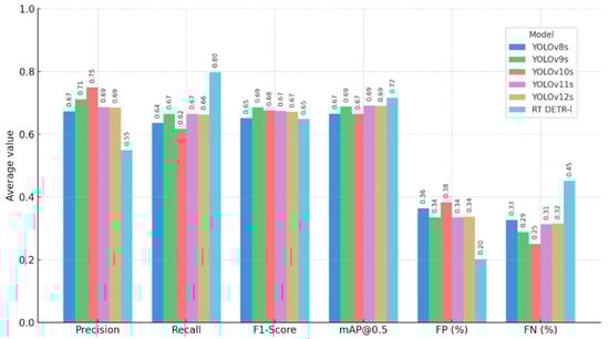 In the baseline evaluation, YOLOv9s showed the best initial balance (global F1 of 0.686). In contrast, RT-DETR-l, despite its high recall, yielded a lower F1 score (<0.648) and a high FN rate, limiting its operational usefulness. With architectural scaling and increased resolution to 2048 × 2048 pixels, the best results were obtained with YOLOv9e-2048 (global F1 of 0.738; mAP@0.5 of 0.779) and YOLOv10m-2048 (global F1 of 0.744; mAP@0.5 of 0.775). These models maintained FN rates around 27–29% without a proportional increase in FP, and showed smooth Precision–Recall curves—altogether indicators of threshold robustness and good inter-class generalization.