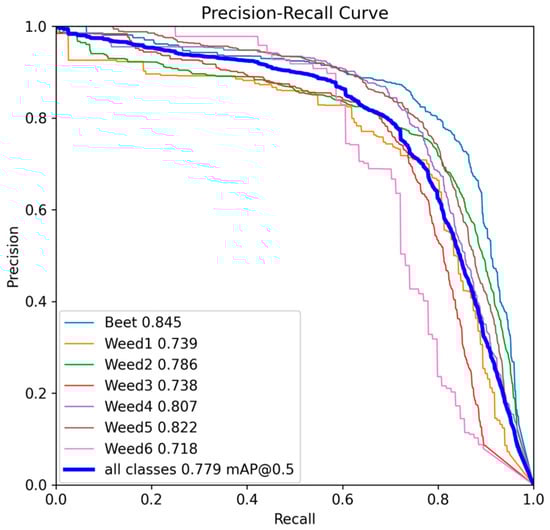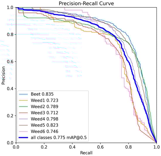 The PR curves (Figure 6) show smooth trajectories without early collapses, indicating stable behaviour across different thresholds. The area under the curve (AP) confirms the following order of per-class performance: Beet (0.845), followed by Weed5 (0.822), then Weed4 (0.807), Weed2 (0.786), Weed3 (0.738), Weed1 (0.739), and finally Weed6 (0.718). In practical terms, Beet, Weed5, and Weed4 maintain high precision even at elevated recall values; Weed2 retains solid behaviour but loses precision when recall exceeds approximately 0.8; and Weed1, Weed3, and Weed6 exhibit an earlier drop in precision, indicating greater sensitivity to occlusions, background texture, and inter-species similarity.