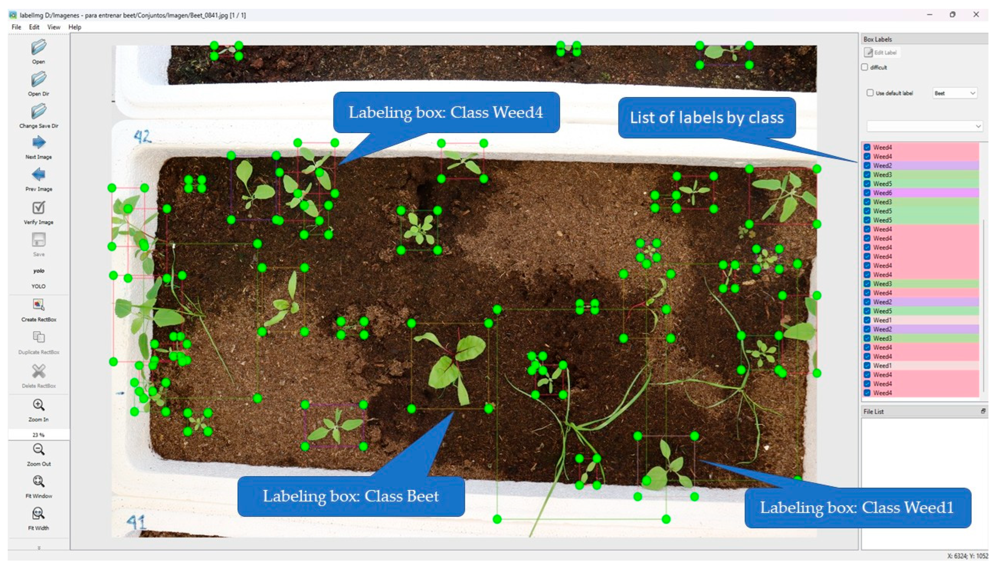 Beta vulgaris L., Conditiva Group). The major contributions of this work are as follows: (1) build a greenhouse RGB dataset for red beet (1630 annotated images; crop + six weed classes) in YOLO format; (2) we propose a three-phase protocol to select architecture, model scale, and input resolution using operationally relevant criteria with emphasis on reducing false negatives; (3) we evaluate multiple YOLO versions (v8–v12) and RT-DETR-l under the same acquisition setting and quantify the effect of scaling and resolution (1024 and 2048 px); and (4) we analyze error modes using precision–recall behavior and confusion patterns to identify candidate configurations for subsequent field validation.