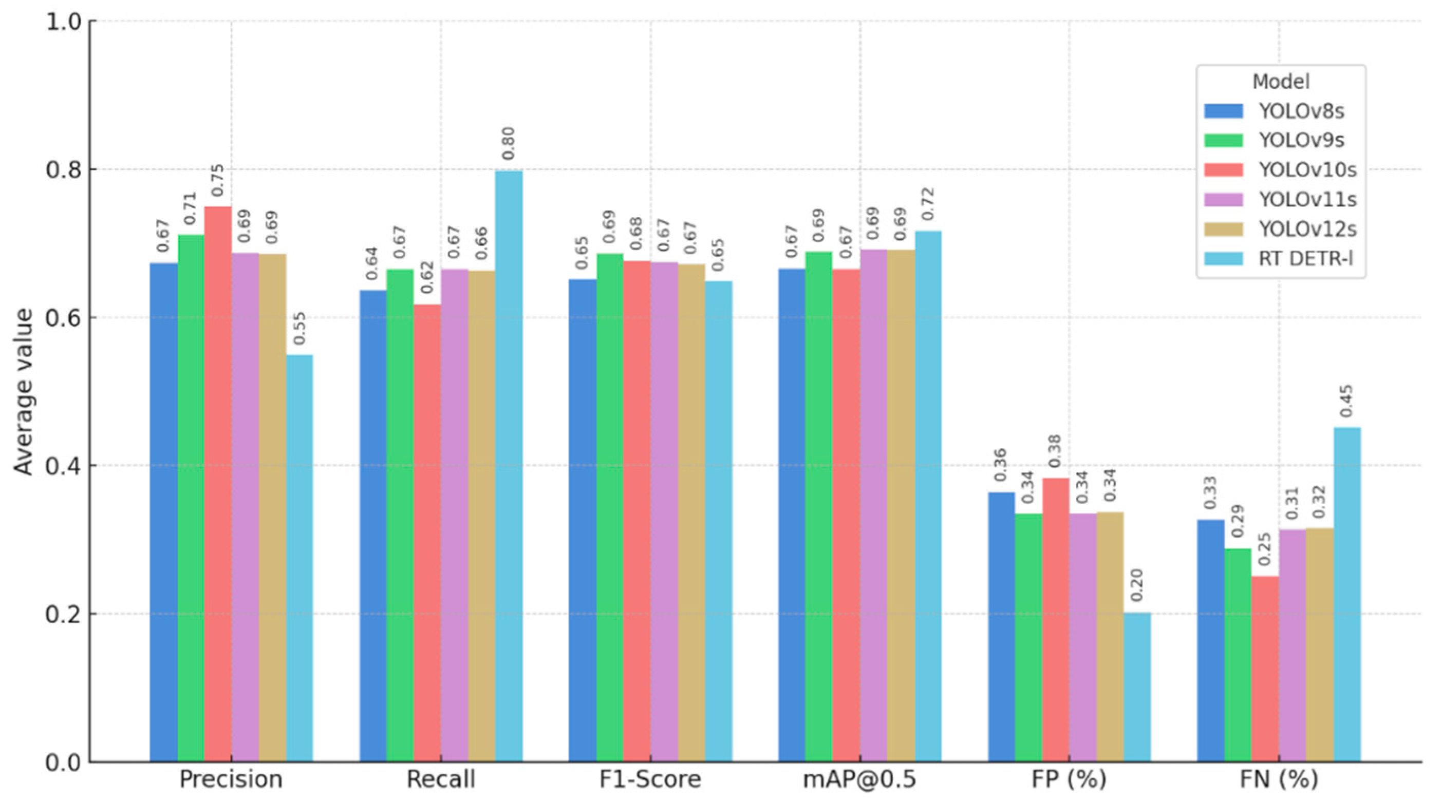 The RT-DETR-l model exhibited an overall intermediate performance, characterized by high sensitivity but limited precision, resulting in less balanced behaviour than that observed for YOLOv9s (