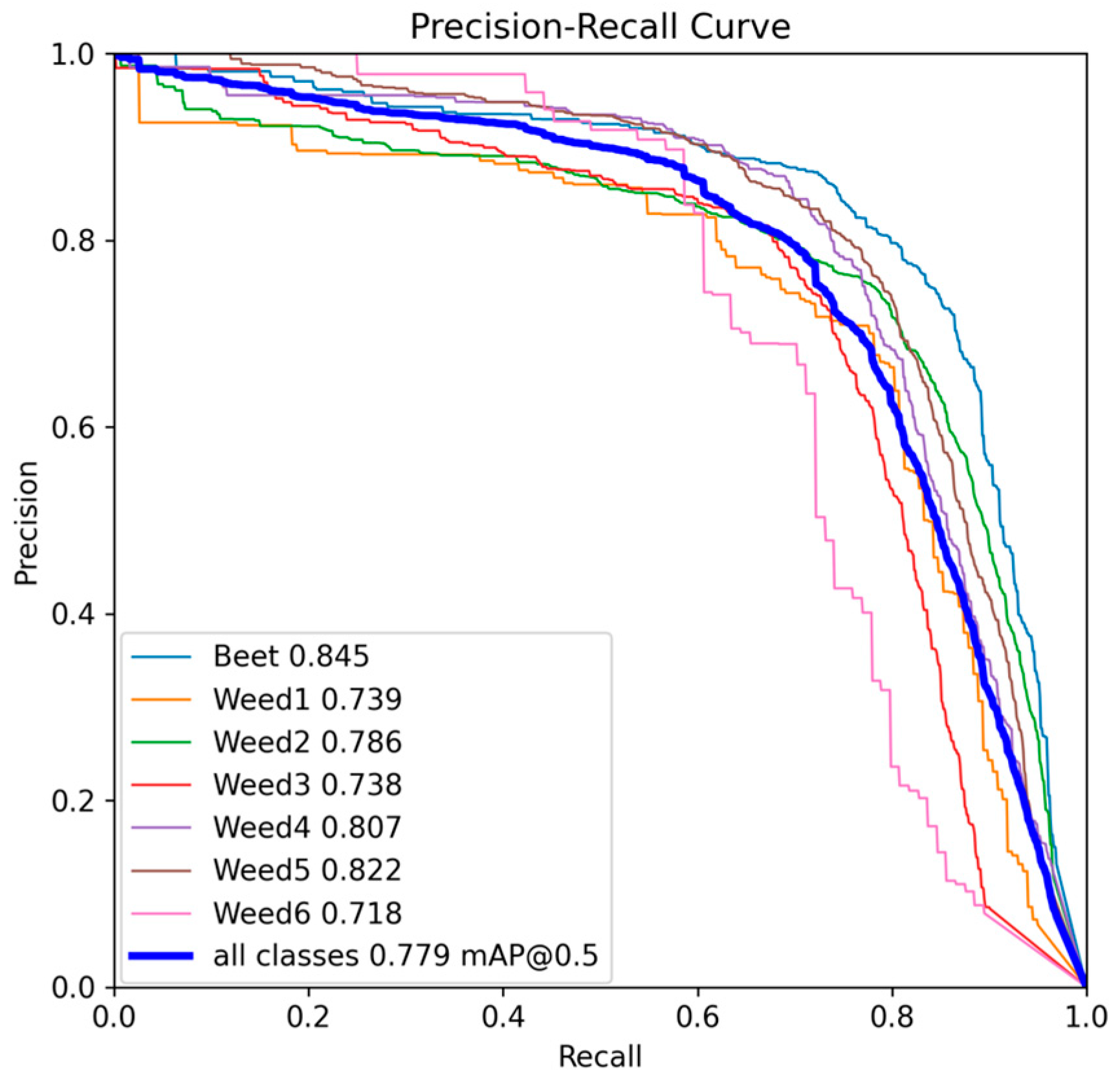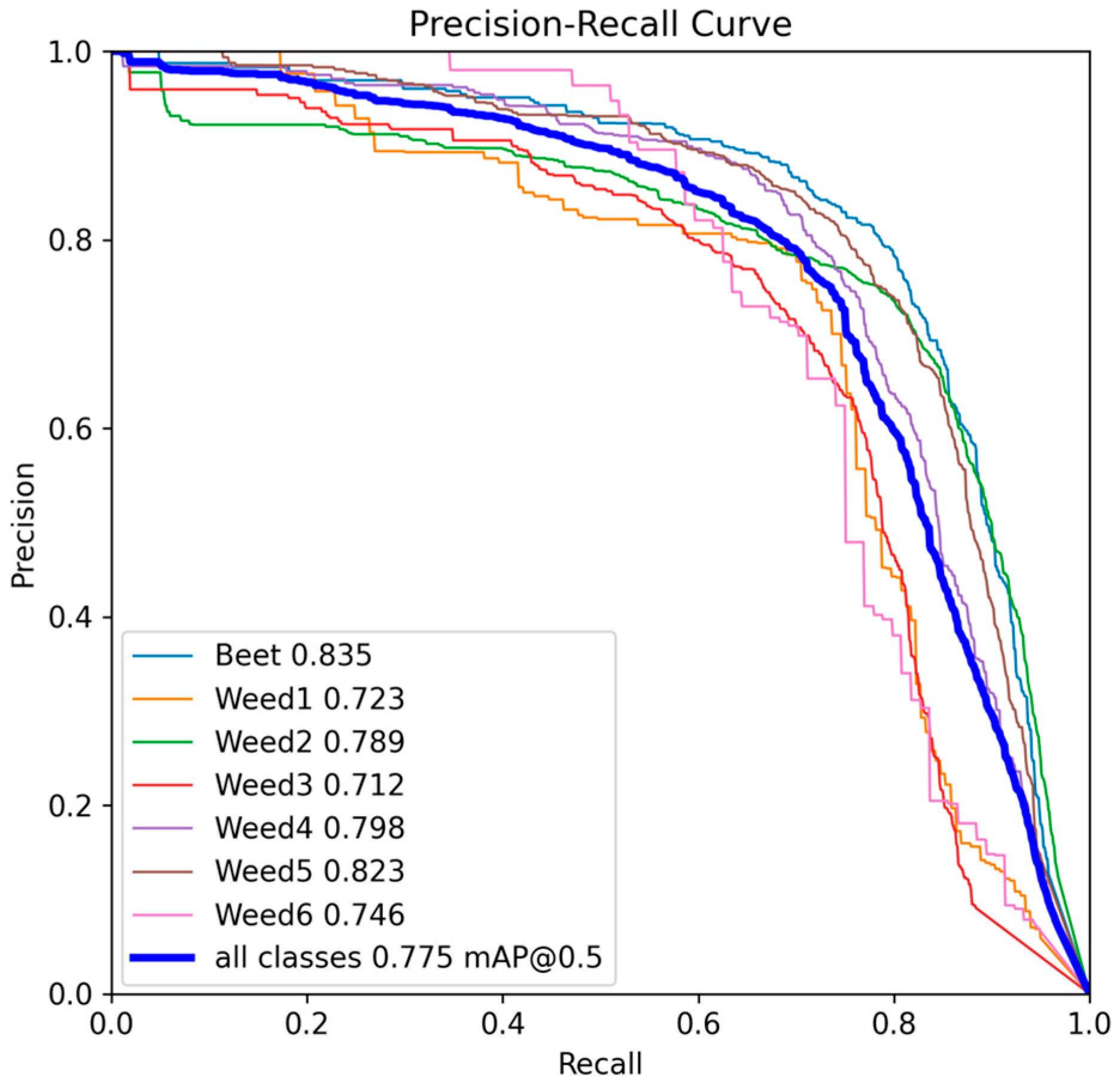 Figure 6) show smooth trajectories without early collapses, indicating stable behaviour across different thresholds. The area under the curve (AP) confirms the following order of per-class performance: Beet (0.845), followed by Weed5 (0.822), then Weed4 (0.807), Weed2 (0.786), Weed3 (0.738), Weed1 (0.739), and finally Weed6 (0.718). In practical terms, Beet, Weed5, and Weed4 maintain high precision even at elevated recall values; Weed2 retains solid behaviour but loses precision when recall exceeds approximately 0.8; and Weed1, Weed3, and Weed6 exhibit an earlier drop in precision, indicating greater sensitivity to occlusions, background texture, and inter-species similarity.