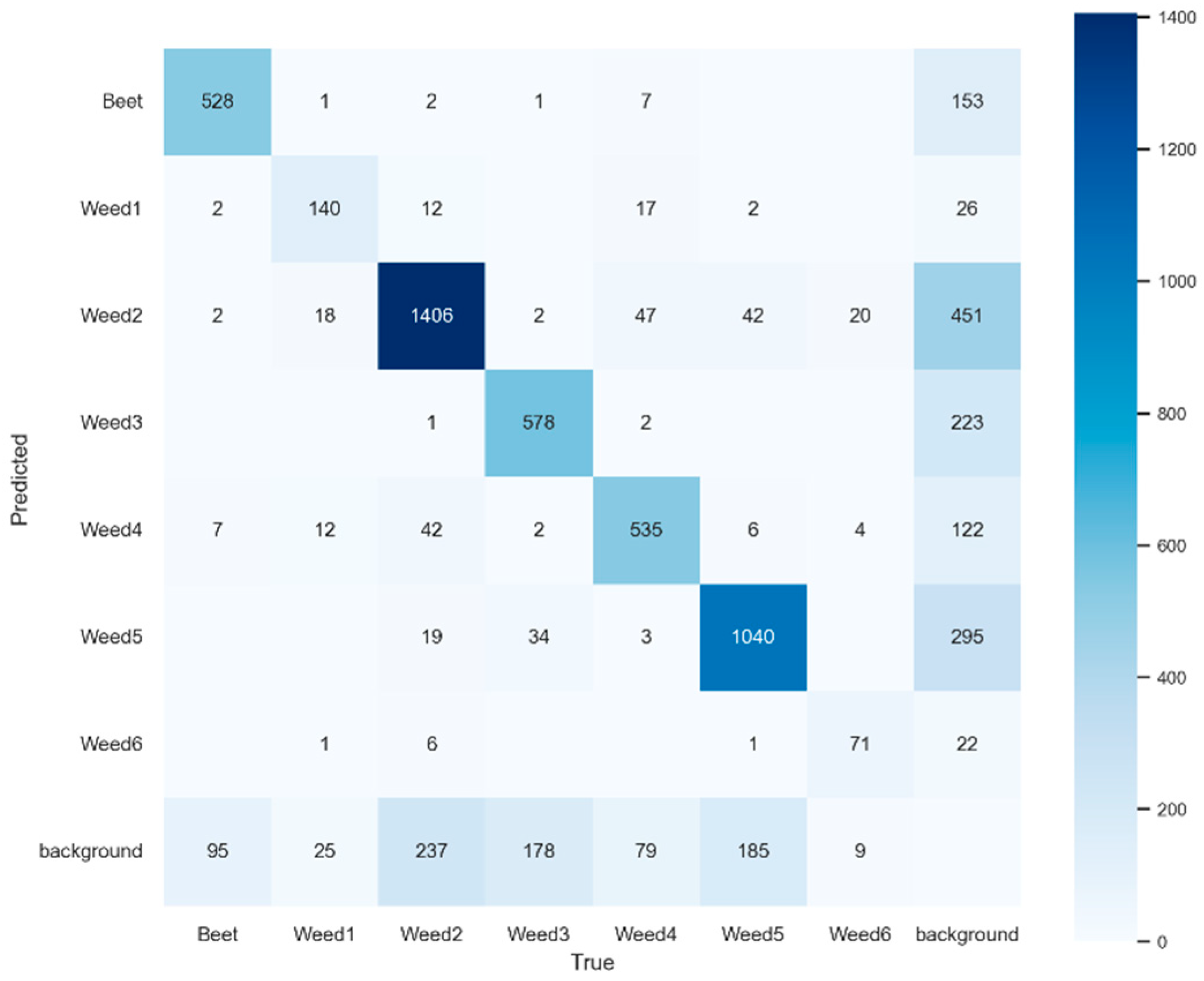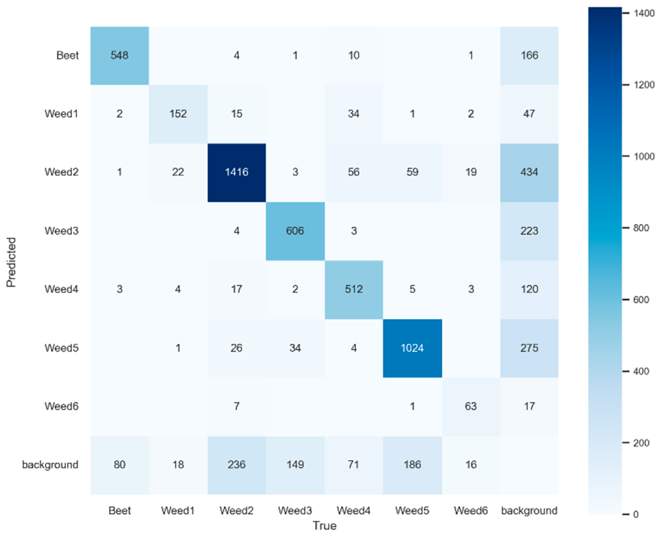 Table 6), with outstanding results for Beet (F1 = 0.714) and Weed3 (F1 = 0.715), whereas Weed2 (F1 = 0.614) and Weed5 (F1 = 0.585) showed the greatest limitations, with error rates above 40%, associated with morphological similarity to the crop and illumination variations during image acquisition.