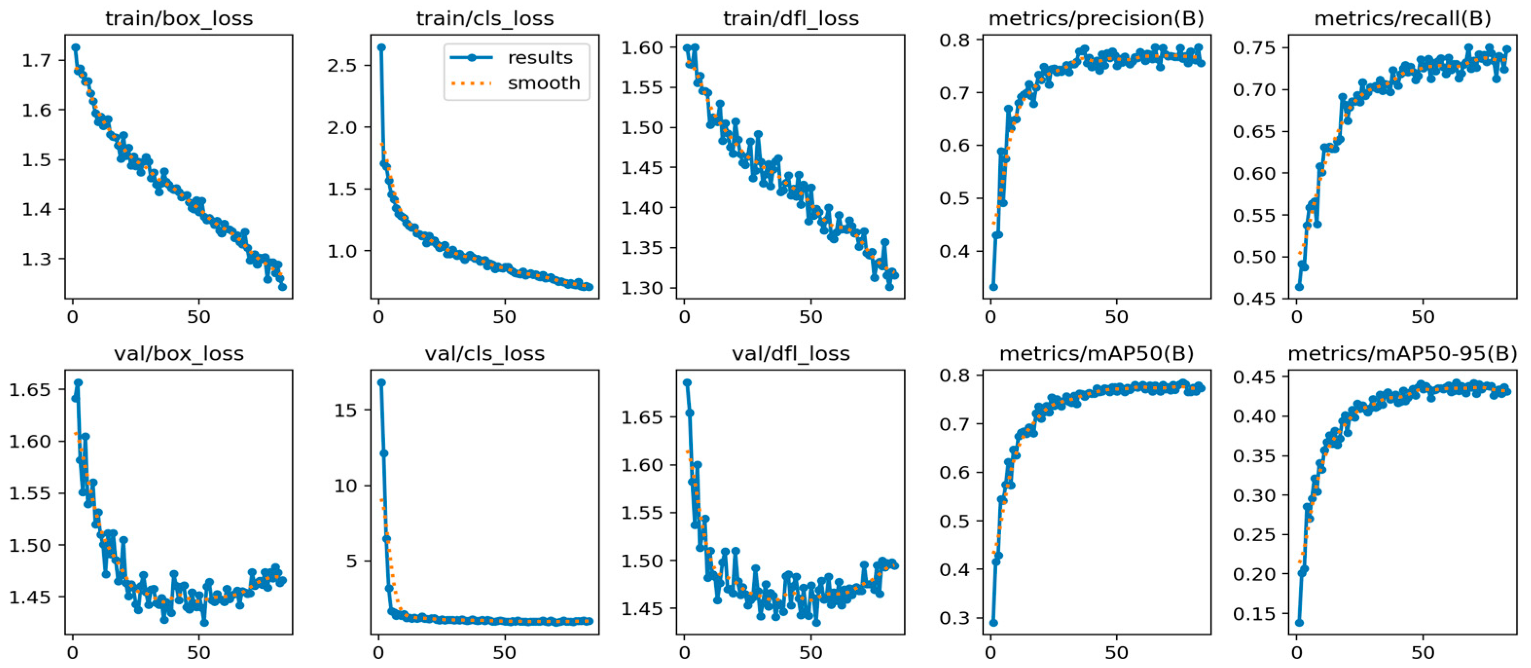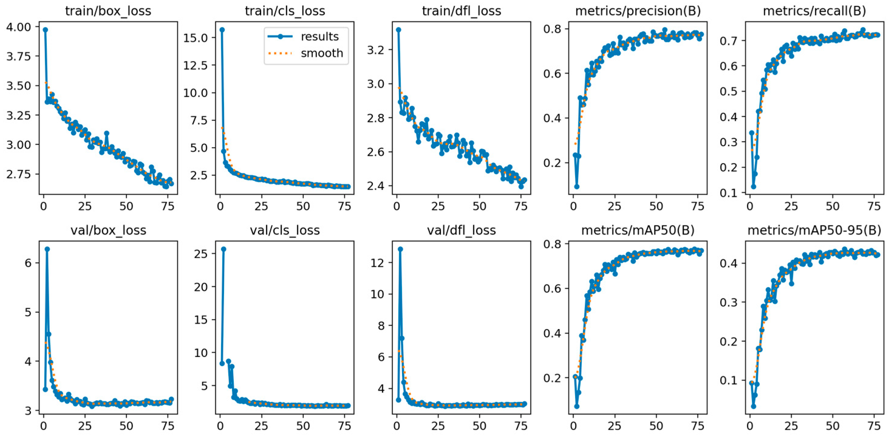 At the same time, performance metrics increase rapidly at the beginning and then stabilize: Precision increases to values close to 0.78–0.79, Recall converges around 0.72–0.73, and mAP@0.5 reaches a plateau close to 0.78, while mAP@0.5:0.95 stabilizes around 0.43. Most of the gain occurs in the first ~20–30 epochs, and subsequent improvements are marginal, supporting that the model reaches a stable and reproducible performance regime.