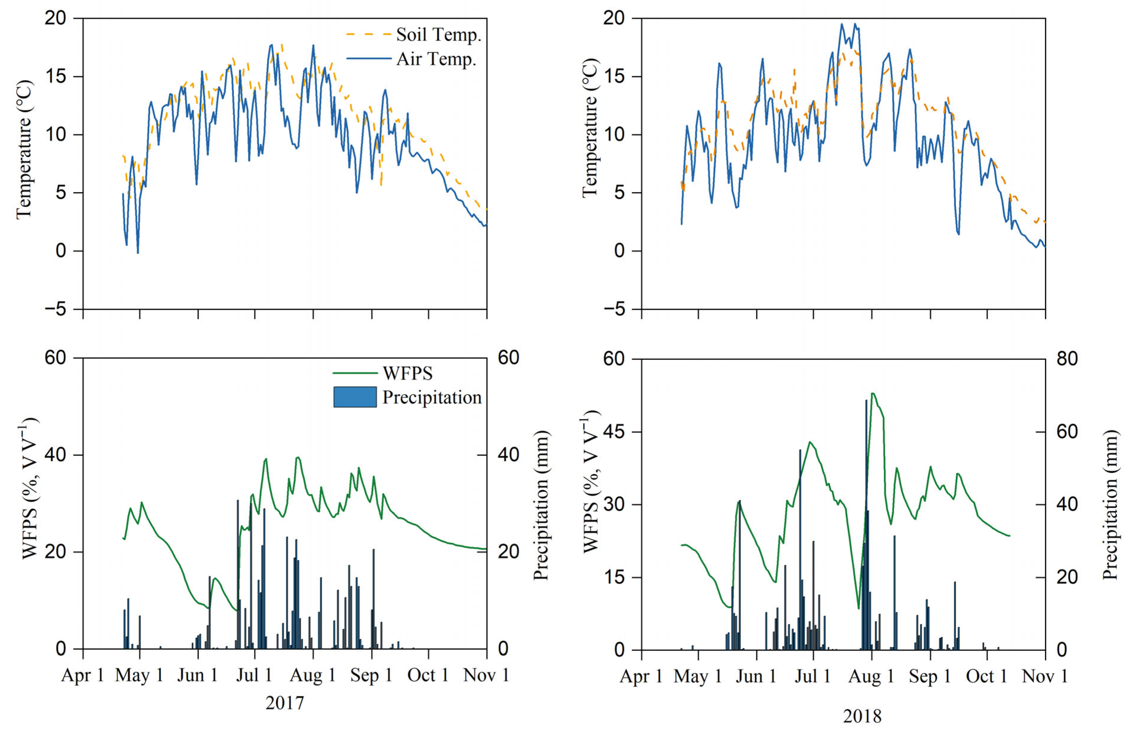 - Linn, D.M.; Doran, J.W. Effect of water-filled pore space on carbon dioxide and nitrous oxide production in tilled and nontilled soils. Soil Sci. Soc. Am. J. 1984, 48, 1267–1272. [Google Scholar] [CrossRef]