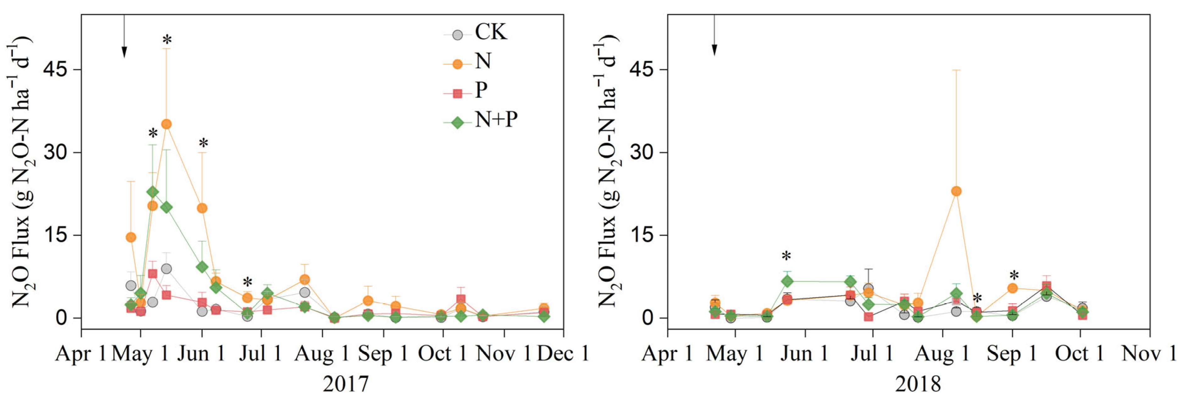 4.1. Effect of N and P Additions on N2O Emissions