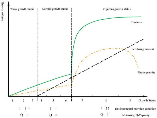 Plant growth is inherently stage-specific [60,61]. Owing to differences in environmental nutrient conditions—particularly the intensity and buffering capacity of nutrient supply—plants can display distinct growth status (vigor and phenotype) even at the same developmental stage. We define the internal nutritional status manifested by these growth differences as “status nutrition”. Plant productive performance varies across different status–nutrition. Based on observable growth characteristics, plant growth status can be classified into three primary categories—weak, normal, and vigorous—corresponding to environmental nutrient supply levels characterized as deficient, appropriate, and excessive, respectively.