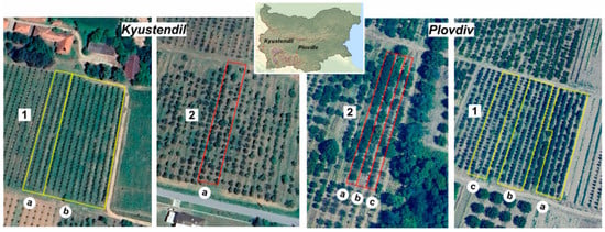 This study was conducted in the experimental orchards of the Institute of Agriculture in Kyustendil and the Institute of Fruit Growing in Plovdiv, Bulgaria, from 2021 to 2023 (Figure 2).