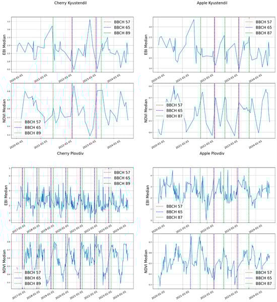 Plot of average NDVI and EBI values for each location and fruit tree type, and the dates of occurrence of the BBCH 57, BBCH 65, and BCH 87 for apple, and BBCH 89 for cherry.