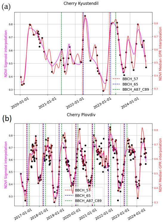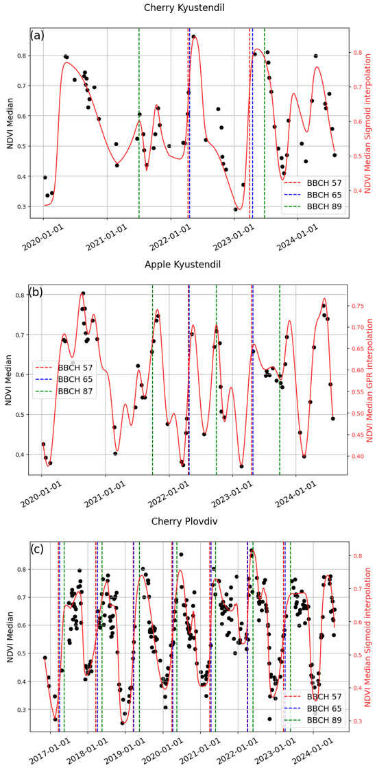 Using cloud-free Sentinel-2 data (≤5% cloud cover), we applied a Land Surface Phenology (LSP) approach to model three phenological stages—BBCH57, BBCH65, and BBCH87/89—in apple and sweet cherry orchards at two locations, Kyustendil and Plovdiv. We used a freely available, modified version of DATimeS called “Intcomparson tool VI”. Phenological stages were modeled using NDVI and EBI derived from quasi-cloud-free Sentinel-2 observations and fitted with both Gaussian Process Regression (GPR) and sigmoid models. Seasonal amplitudes derived from the start of season (SoS) and end of season (EoS) were used to estimate phenological timing, and the modeled phenological stages were evaluated against field observations.