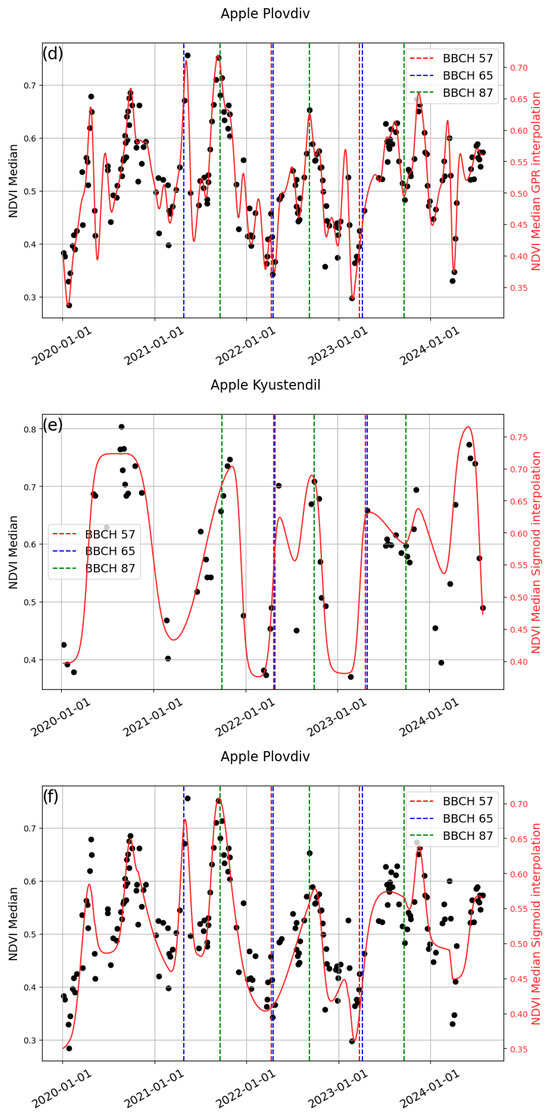 DATimeS uses a method to identify changes in the growing season by searching for local minima and maxima in the growth curve. A salience threshold is used to filter out noise and artifacts. This threshold determines whether a peak is significant enough to be considered a true seasonal change. Adjusting the salience threshold fine-tunes the method’s sensitivity, helping avoid false season identification. In this study, we tested visibility thresholds at 10%, 20%, 30%, 40%, and 50% in 10% increments. Our results show that a 20% salience threshold provides the most accurate results. The growing seasons of cherries and apples typically occur within a single calendar year. Therefore, when two growing seasons are detected within a single year, they are merged by concatenating the two seasons. We used two methods to reconstruct the time series: sigmoid and Gaussian process regression (GPR) [61]. The double logistic curve, or sigmoid, uses a double-sigmoidal model by combining two regular sigmoidal functions to characterize phenological indices [51]. The double sigmoidal model is uniquely defined by six parameters: two midpoints (c and d), two slope parameters (d and e), a maximum value (b), and a baseline (a). GPR is a kernel-based, non-parametric method. It fits a curve without making strong assumptions about the shape. The kernel function used in our study is the Squared Exponential kernel (SE). The choice of kernel hyper-parameters minimizes the squared prediction error while maximizing the marginal likelihood. Phenological indices, such as the start of season (SoS) and end of season (EoS), are derived from the seasonal amplitude. This amplitude is calculated as the difference between the peak value and the average of the left and right minimum values for each season. SoS and EoS are determined at the point where the left or right side of the curve reaches a certain fraction of this seasonal amplitude. In this study, we examined seasonal amplitude at 5% increments, ranging from 5% to 95%. We analyzed the seasonal amplitudes of SoS to identify the three phenological stages, BBCH57, BBCH65, and BBCH89. For BBCH89, we also estimated the seasonal amplitude of EoS. The dual analysis for BBCH87/89 was necessary because it was unclear whether this stage occurred before or after the peak values of the studied VIs, as evident in the original remote sensing data (Figure 4). In summary, as indicated in Table 3, we used the following parameters in the modified version of DATimeS, known as the “internal comparison VIs tool”.