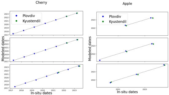 For sweet cherry orchards, regardless of location, the sigmoid model achieved the best RMSE values of 12, 14, and 36 days for BBCH57, BBCH65, and BBCH89, respectively. For apple orchards, GPR yielded the best RMSE for BBCH57 and BBCH65 (23 and 29 days, respectively), while the sigmoid model provided the best performance for BBCH87, with an RMSE of 26 days.
