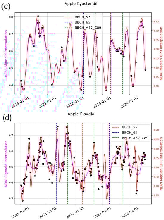 Vegetation cover significantly affects the ability to detect phenological changes [51] and environmental factors accurately. The timing of phenological events can change rapidly; so, frequent satellite observations are crucial. Unfortunately, cloud cover often limits the availability of explicit images, making it difficult to accurately track these changes [51]. The vegetation cover of the study area is not homogeneous. In the plots in Plovdiv, there was no grass between the trees in the inter-row, whereas in Kyustendil, there was grass cover in the rows. The presence of mixed pixels—including trees, grass, or soil—adds complexity to the phenological analysis based on satellite observations; see the explanation in Section 2.2. Data collection is another complication arising from the different phenological patterns of the trees: cherry trees’ leaves appear before flowering, while in apple trees, the appearance of leaves precedes flowering.