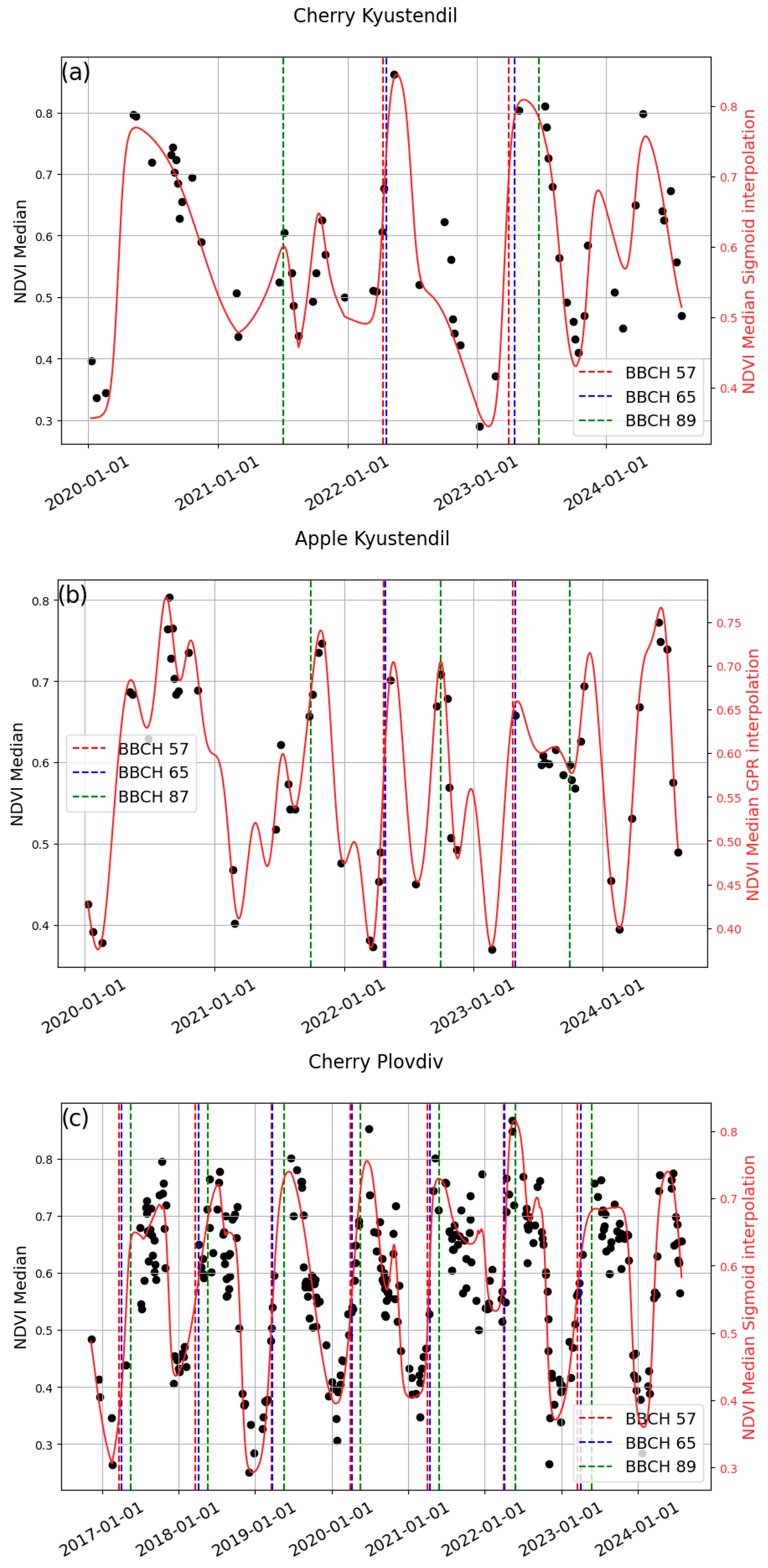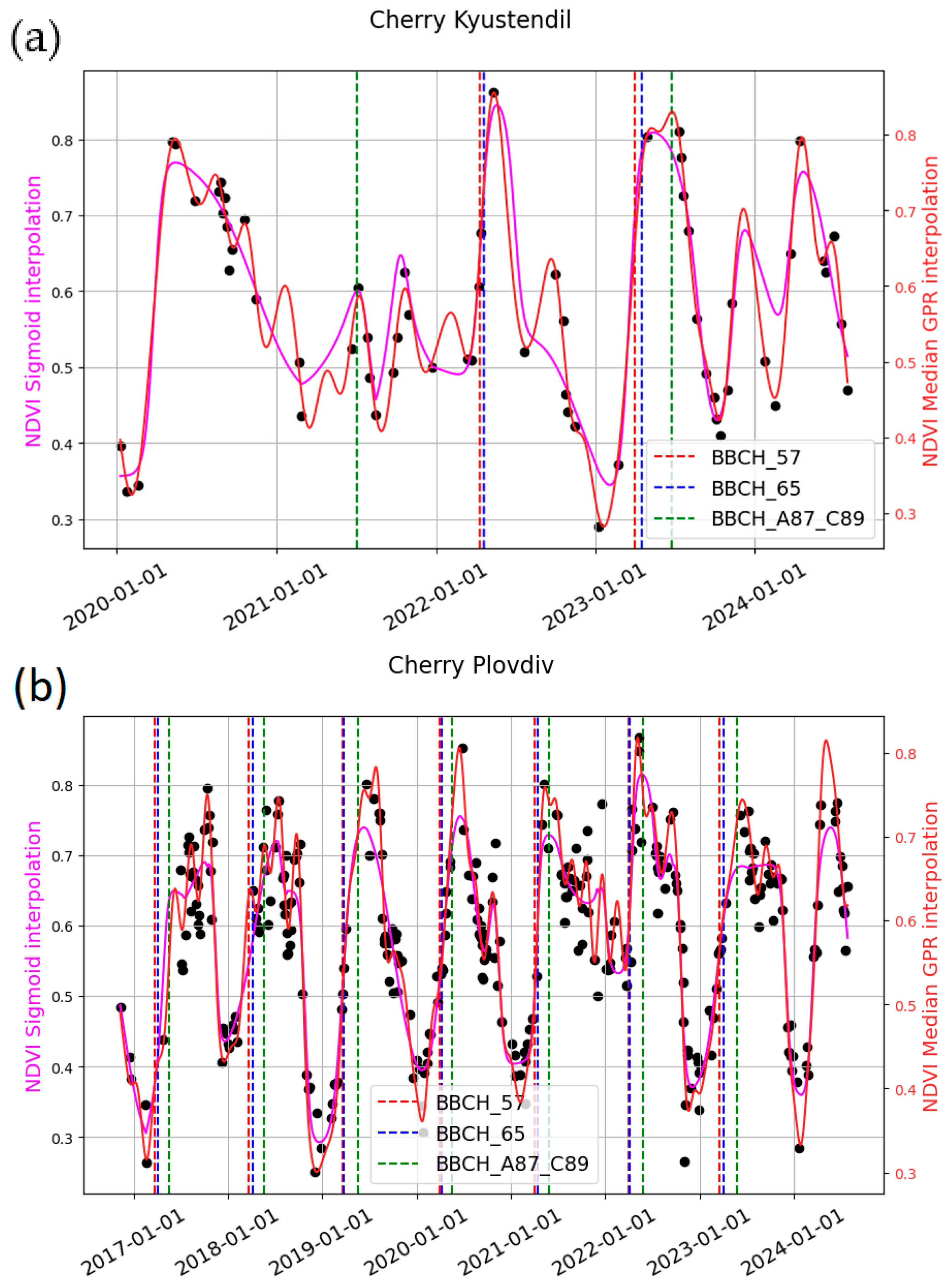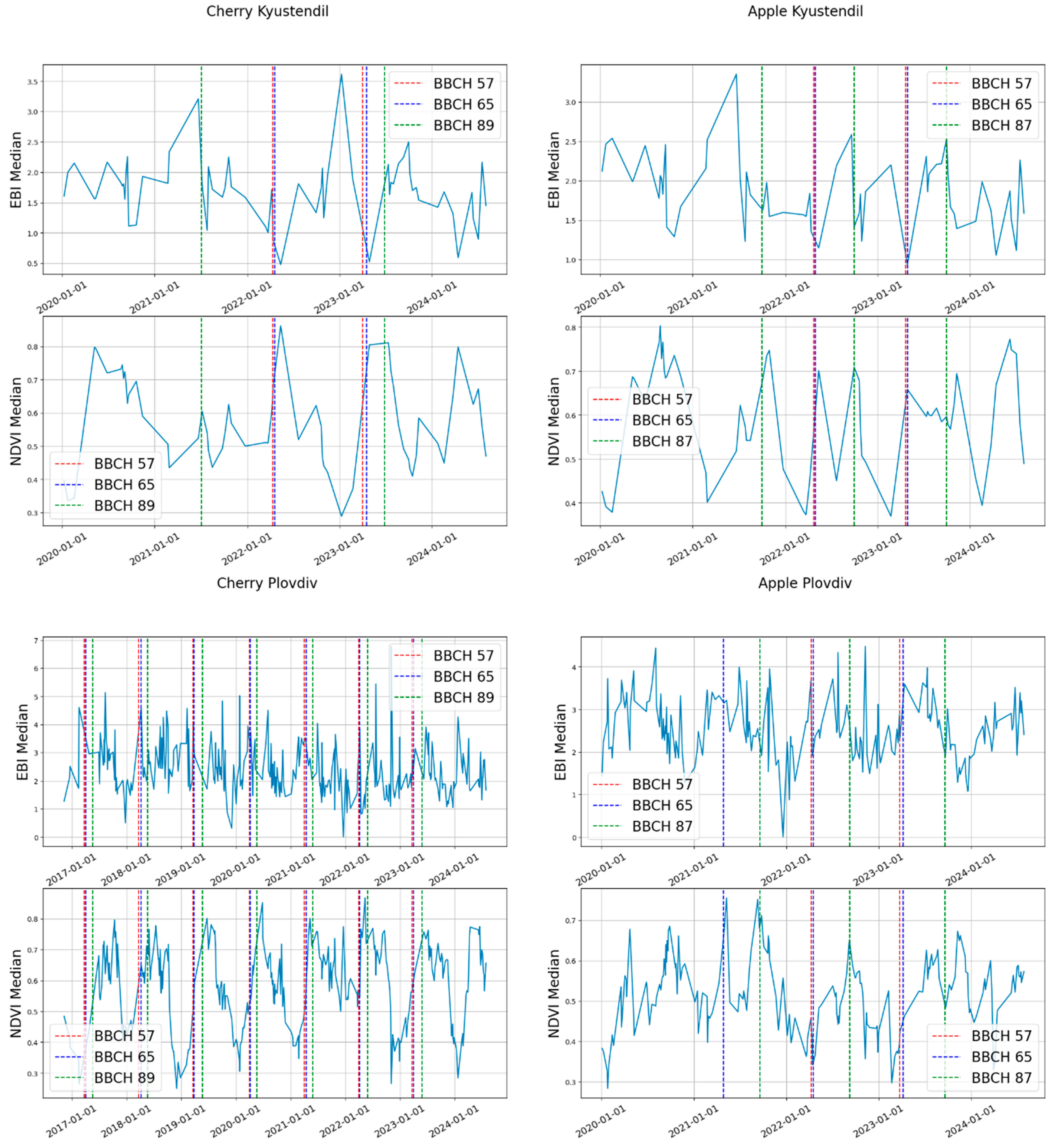 - With LSP modeling, NDVI outperforms EBI in most cases. Depending on the dataset, GPR or sigmoid models performed better. SOS proved to be the more appropriate phenological metric for BBCH 87/89. The best RMSE for cherry and apple trees falls within 12 to 36 days, but it is unsuitable for operational use in orchard monitoring. Modeling homogeneous and large orchards of only one species should provide better results using Sentinel-2 images.