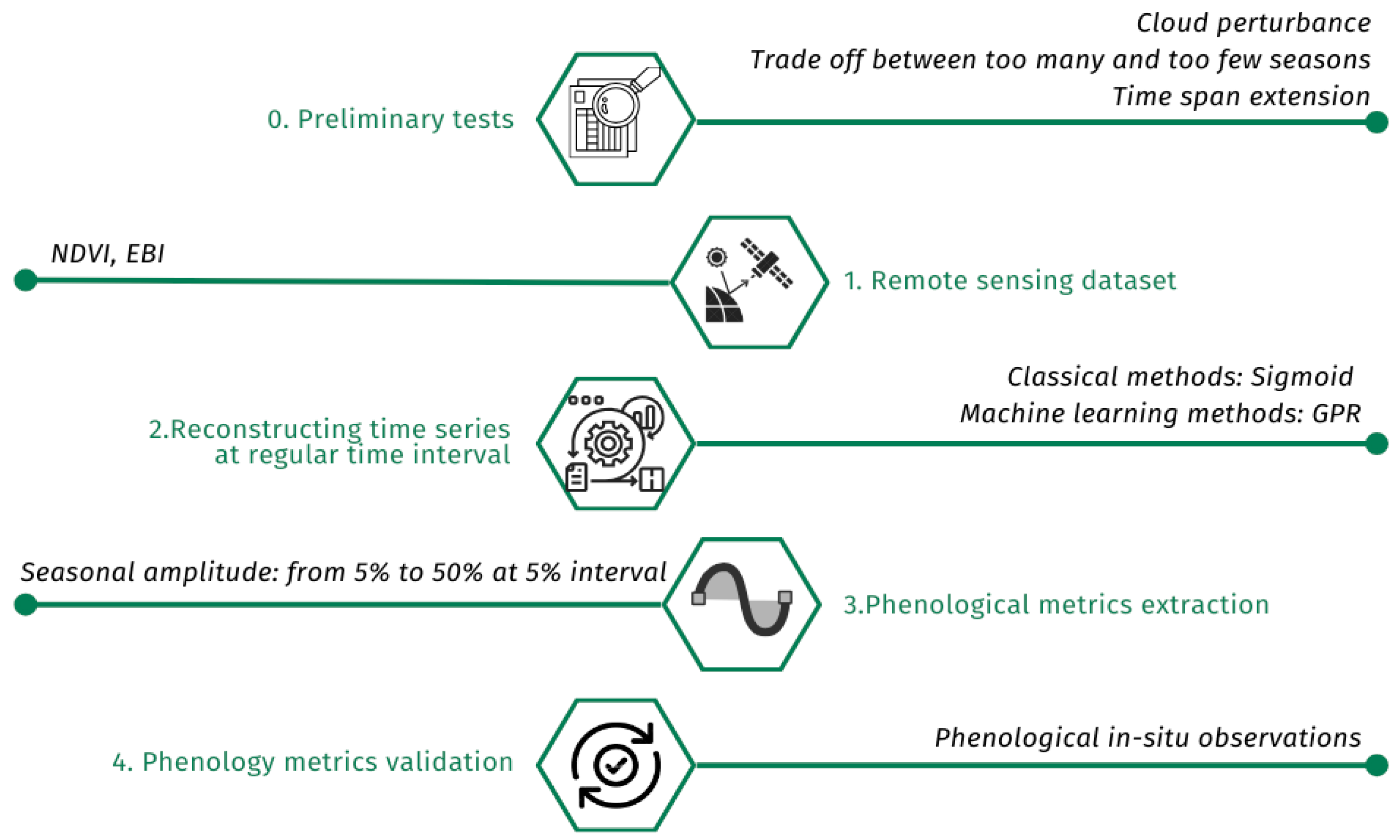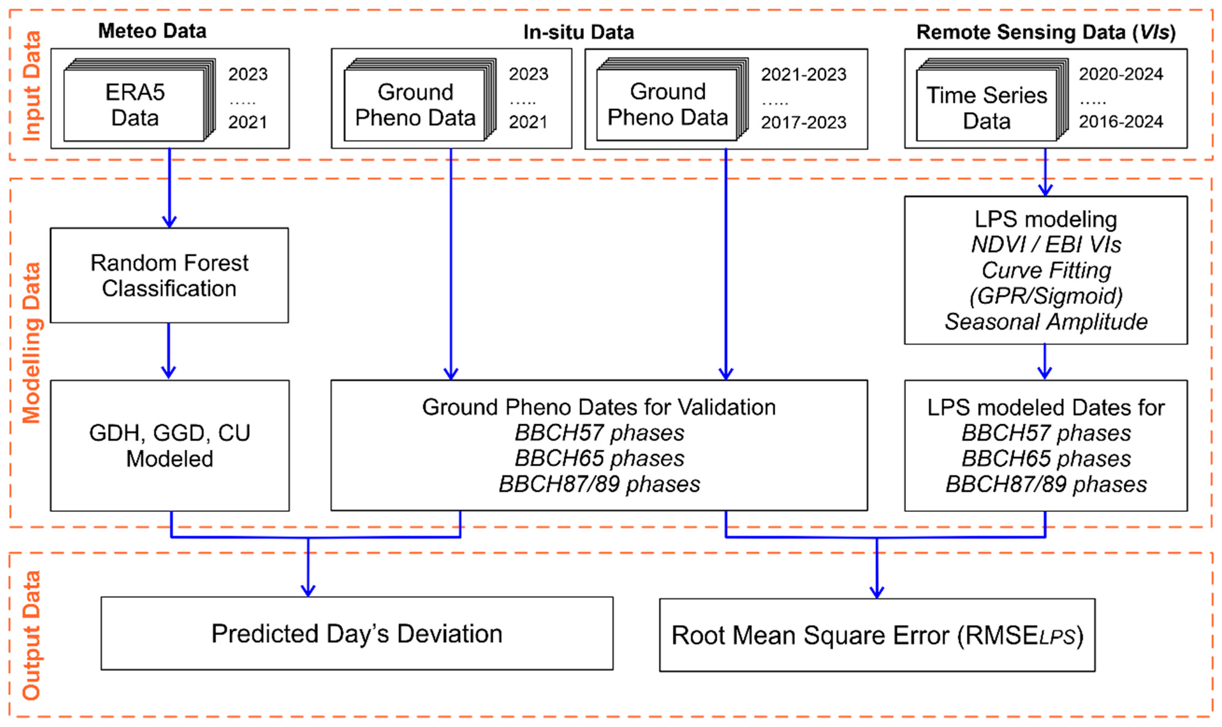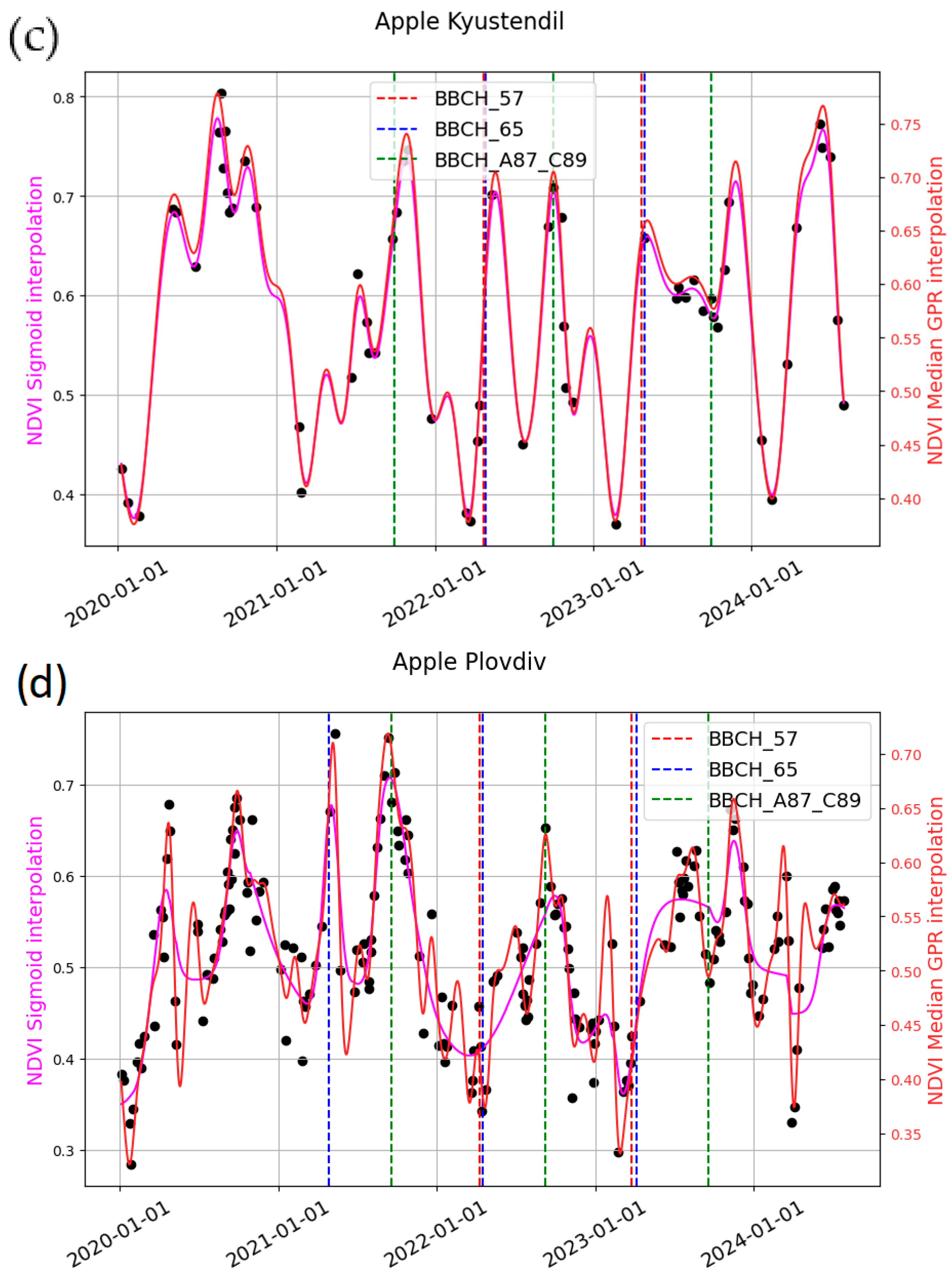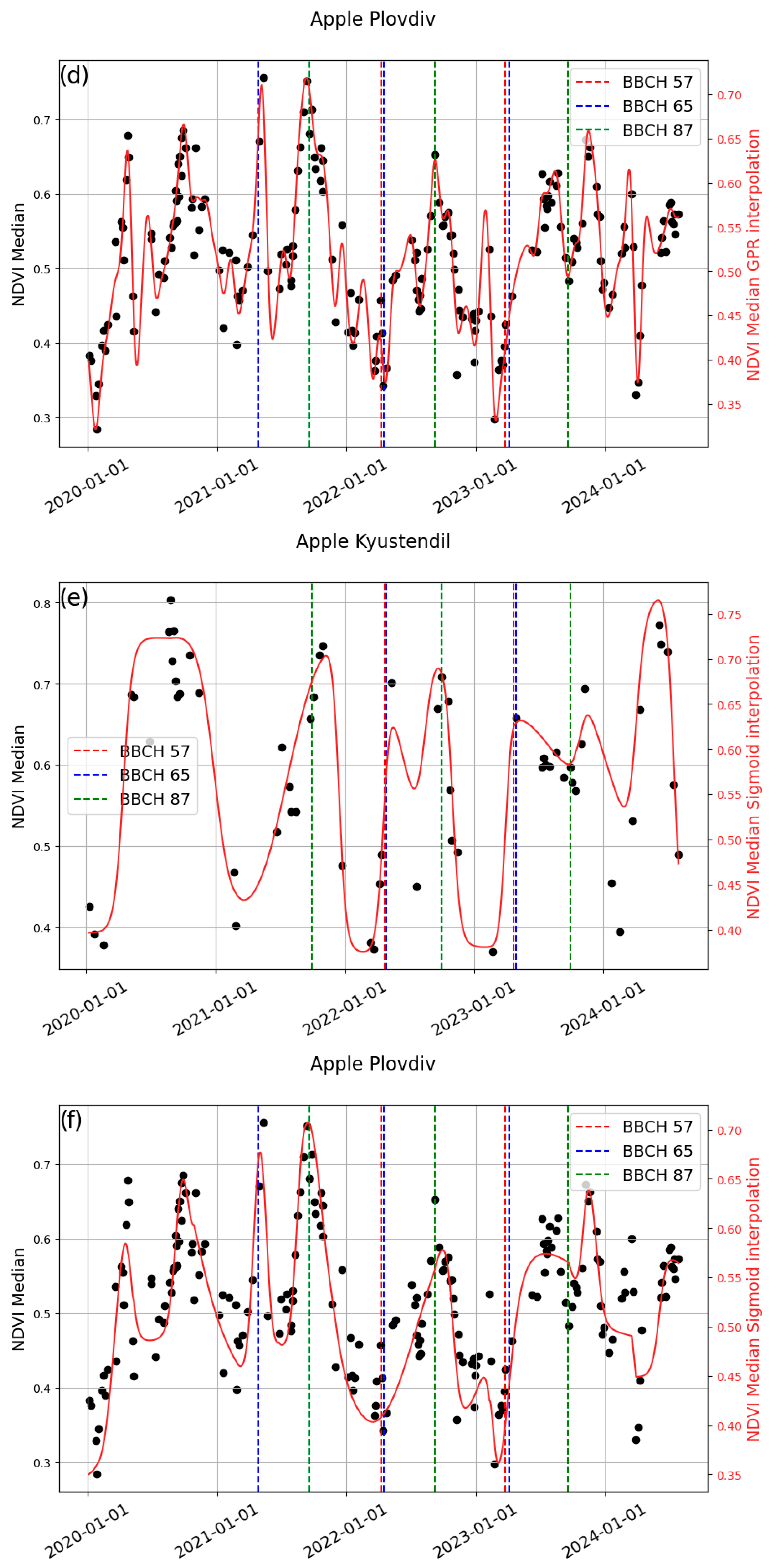 - With LSP modeling, NDVI outperforms EBI in most cases. Depending on the dataset, GPR or sigmoid models performed better. SOS proved to be the more appropriate phenological metric for BBCH 87/89. The best RMSE for cherry and apple trees falls within 12 to 36 days, but it is unsuitable for operational use in orchard monitoring. Modeling homogeneous and large orchards of only one species should provide better results using Sentinel-2 images.