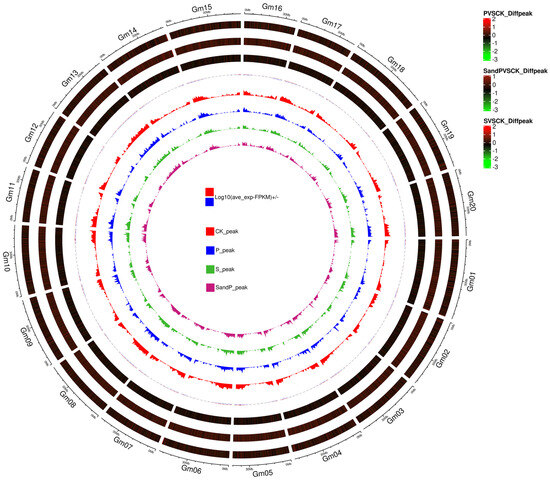 Circos plot of genome-wide m6A modifications in soybean roots inoculated with SMV and/or Psg. From outside to inside, the eight rings represent: (1) genomic location, (2) density of differentially modified m6A peaks between P and CK plants, (3) density of differentially modified m6A peaks between S + P and CK plants, (4) density of differentially modified m6A peaks between S and CK plants, (5) genome-wide distribution of m6A peak density in CK plants, (6) genome-wide distribution of m6A peak density in P plants, (7) genome-wide distribution of m6A peak density in S plants, and (8) genome-wide distribution of m6A peak density in S + P plants.