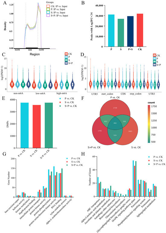 Distinct patterns of m6A modification were observed at both the genome and transcript levels. At the genome level, m6A peaks were highly concentrated near chromosomal telomeres, consistent with gene density (Figure 2). At the transcript level, m6A peaks were highly enriched near stop codons and in 3′-UTR regions, but they were also present in CDS and 5′-UTR regions (Figure 3A). We identified 51,618, 54,939, 49,284, and 50,147 peaks in the CK, P, S, and P + S samples, respectively. Of these, 31,909, 31,109, 26,938, and 29,510 peaks were confidently associated with 22,776, 22,890, 20,921, and 22,042 genes (log2|foldchange| ≥ 1 and p < 0.05) (Tables S2–S5, Figure 3B). Therefore, fewer m6A peaks were detected in the P, S, and P + S groups than in the CK. Compared with the Input group, these peaks showed a greater degree of enrichment at transcription start sites (TSSs) and transcription end sites (TESs) (Figure S1). Overall, the expression levels of m6A-modified genes were lower than those of genes without such modifications (Figure 3C). Genes with m6A modifications in the 5′-UTR and TSS regions had higher expression than genes with m6A modifications in the 3′-UTR, TES, and CDS regions; genes with m6A modifications in the 3′ UTR had the lowest expression (Figure 3D).