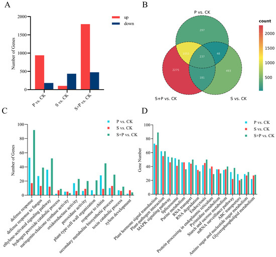 There were 1794 upregulated and 475 downregulated DEGs in the S + P vs. CK comparison (Table S11, Figure 4A), many of which were again annotated with GO terms related to transcription and defense responses. They shared 16 of the same top 20 enriched KEGG pathways with DEGs from the P vs. CK comparison, but they were also enriched in fructose and mannose metabolism, cyanoamino acid metabolism, and linoleic acid metabolism. Compared with the S vs. CK DEGs, the S + P vs. CK DEGs were uniquely enriched in glycerophospholipid metabolism, fatty acid degradation, RNA transport, other glycan degradation, and linolenic acid metabolism (Figure 4C,D).