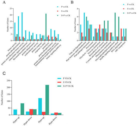 Differentially m6A-methylated DEGs in soybean leaves during SMV and Psg infection. (A,B) Numbers of DMPs and DEGs associated with specific GO terms (A) and KEGG pathways (B) in three comparison groups: P vs. CK, S vs. CK, and P + S vs. CK. (C) Distribution of differentially m6A-methylated DEGs across four categories: hyper-up (hypermethylated and upregulated), hyper-down (hypermethylated and downregulated), hypo-up (hypomethylated and upregulated), and hypo-down (hypomethylated and downregulated).