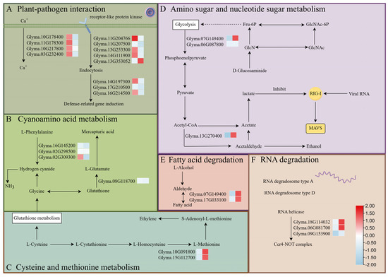 Proposed model showing how significant changes in the m6A-methylation status and expression of soybean genes during SMV infection could influence (A) plant-pathogen interaction, (B) cyanoamino acid metabolism, (C) cysteine and methionine metabolism, (D) amino sugar and nucleotide sugar metabolism, (E) the fatty acid degradation pathway, and (F) the RNA degradation pathway. In the small heatmaps, the left-hand box shows the change in m6A-methylation upon infection (blue, reduced; red, increased), and the right-hand box shows the change in gene expression.