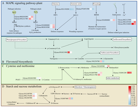 Proposed model showing how significant changes in the m6A-methylation status and expression of soybean genes during co-infection with Psg and SMV could influence (A) the MAPK signaling pathway, (B) the flavonoid biosynthesis pathway, (C) the cysteine and methionine pathway, and (D) starch and sucrose metabolism. In the small heatmaps, the left-hand box shows the change in m6A-methylation upon infection (blue, reduced; red, increased), and the right-hand box shows the change in gene expression.