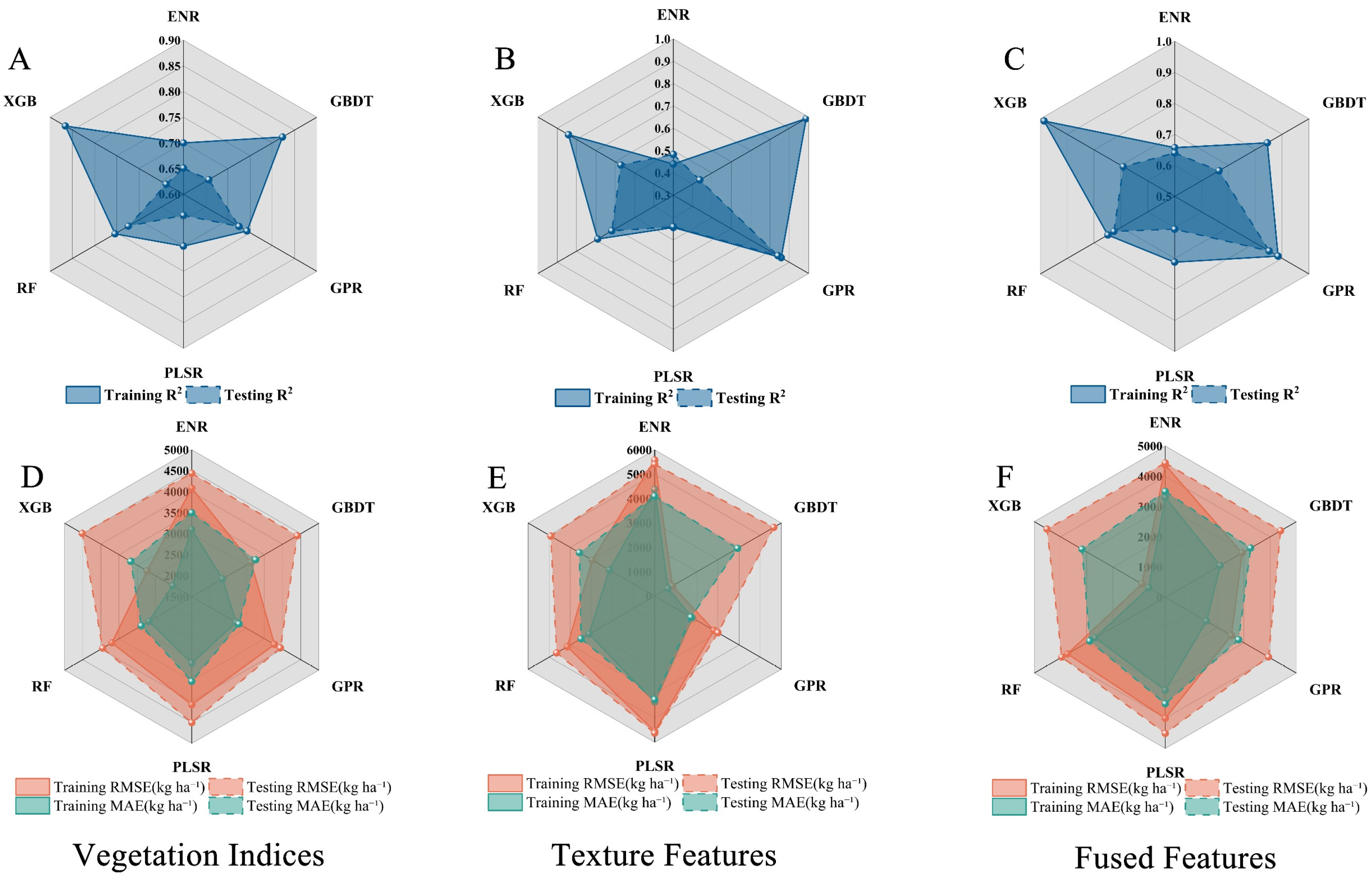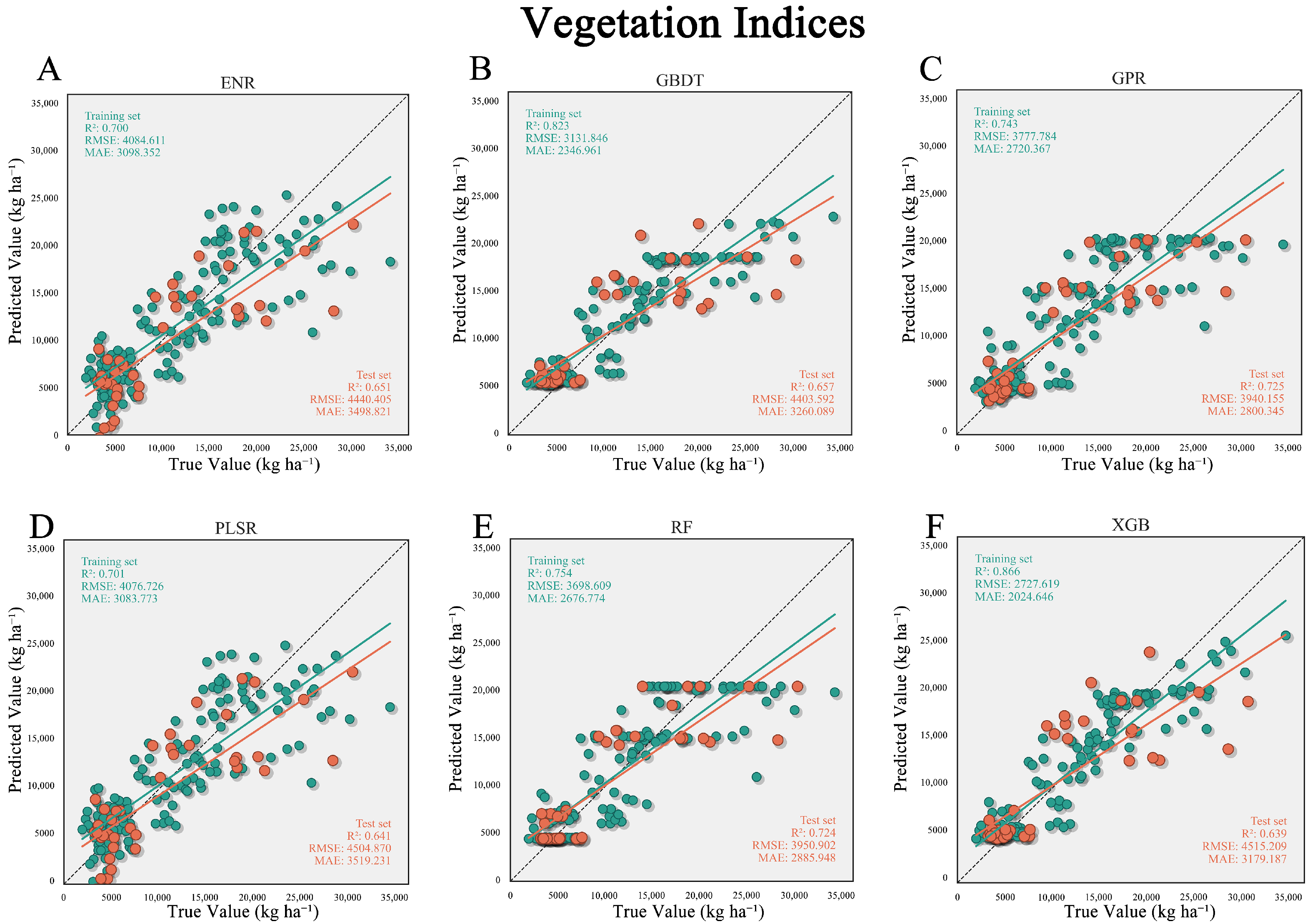 | Vegetation Indices Features | ENR | 0.700 | 4084.611 | 3098.352 | 0.651 | 4440.405 | 3498.821 |