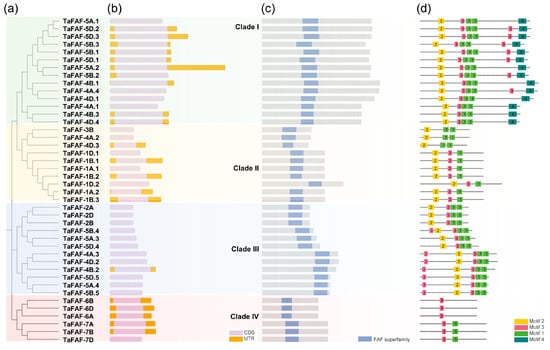To investigate the evolutionary relationships among TaFAF genes, we constructed a phylogenetic tree based on their full-length amino acid sequences. The 42 TaFAF proteins were classified into four distinct clades, designated TaFAF-I to TaFAF-IV. TaFAF-I represented the largest clade, comprising 14 genes, all located on homoeologous groups 4 and 5. In contrast, TaFAF-IV was the smallest clade, containing six genes exclusively distributed on homoeologous groups 6 and 7 (Figure 2a). Furthermore, our analysis of TaFAF genes in comparison with their homologues from wheat progenitor species revealed that four triple homoeologous TaFAFs were located on chromosome groups five, six, and seven. These genes were more conserved than their orthologs in Aegilops tauschii, Triticum turgidum, and Triticum urartu (Figure S2). Despite substantial variation in gene length, gene structure analysis indicated that all TaFAF genes were highly conserved and consisted of a single exon (Figure 2b). Consistently, all TaFAF proteins contained only one conserved FAF domain (Figure 2c). Motif prediction analysis identified four conserved motifs, each 21–36 amino acids in length, across the TaFAF family (Figure S3). Notably, all TaFAF-I members contained at least four motifs, whereas TaFAF-IV members possessed only one or two motifs (Figure 2d). Together, these phylogenetic, structural, and motif analyses highlight the conserved organization and clade-specific diversification of the TaFAF gene family in wheat.