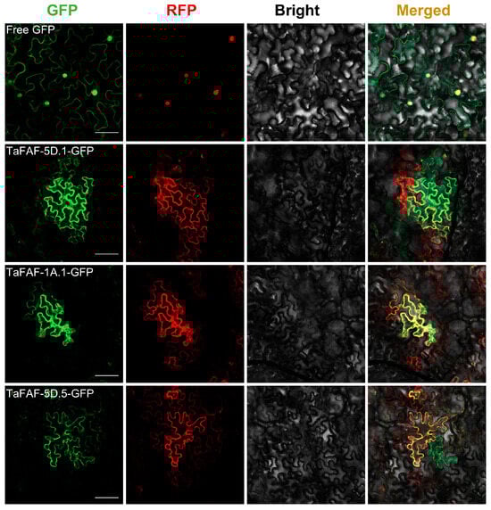 To determine the subcellular localization of TaFAFs, we selected three representative genes (TaFAF-5D.1, TaFAF-1A.1, and TaFAF-5D.5) and fused their coding sequences to GFP. The resulting fusion constructs were transiently co-expressed in Nicotiana benthamiana leaf epidermal cells with an mCherry-tagged cytoplasmic protein under the control of the CaMV 35S promoter. Fluorescence microscopy showed that the GFP signals were well overlapped with the mCherry signals for all three fusion proteins (Figure 5), indicating that TaFAF-5D.1, TaFAF-1A.1, and TaFAF-5D.5 are localized in the cytoplasm.
