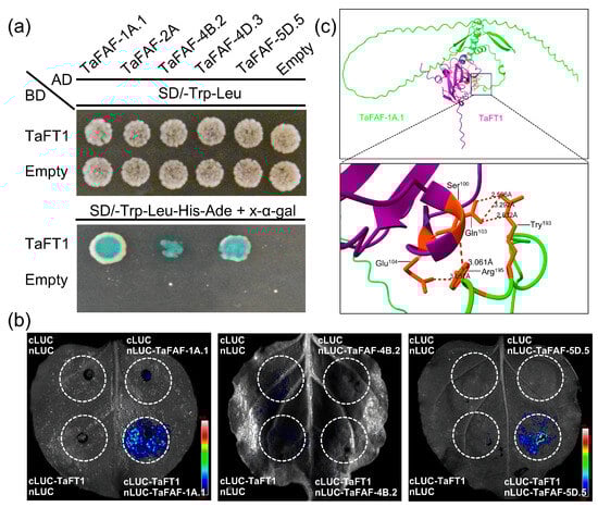 TaFT1 functions as a key regulator of flowering time in wheat. To assess potential protein–protein interactions between TaFT1 and TaFAF family members, five representative TaFAFs were selected for Y2H assays. The results showed that TaFAF-1A.1, TaFAF-4B.2, and TaFAF-5D.5 interacted with TaFT1, whereas no interaction was detected for TaFAF-2A or TaFAF-4D.3 (Figure 7a). To validate these interactions in planta, split-luciferase complementation imaging assays were performed in Nicotiana benthamiana leaf epidermal cells. These assays confirmed interactions between TaFT1 and TaFAF-1A.1 as well as TaFAF-5D.5, but not between TaFT1 and TaFAF-4B.2 (Figure 7b).