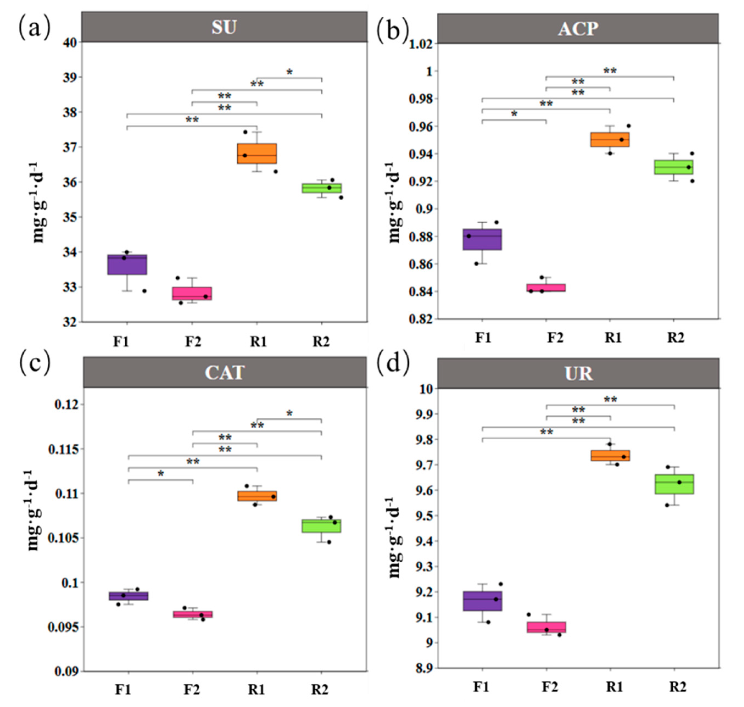 | Treatment | SU (mg·g−1·d−1) | ACP (mg·g−1·d−1) | CAT (mg·g−1·d−1) | UR (mg·g−1·d−1) |