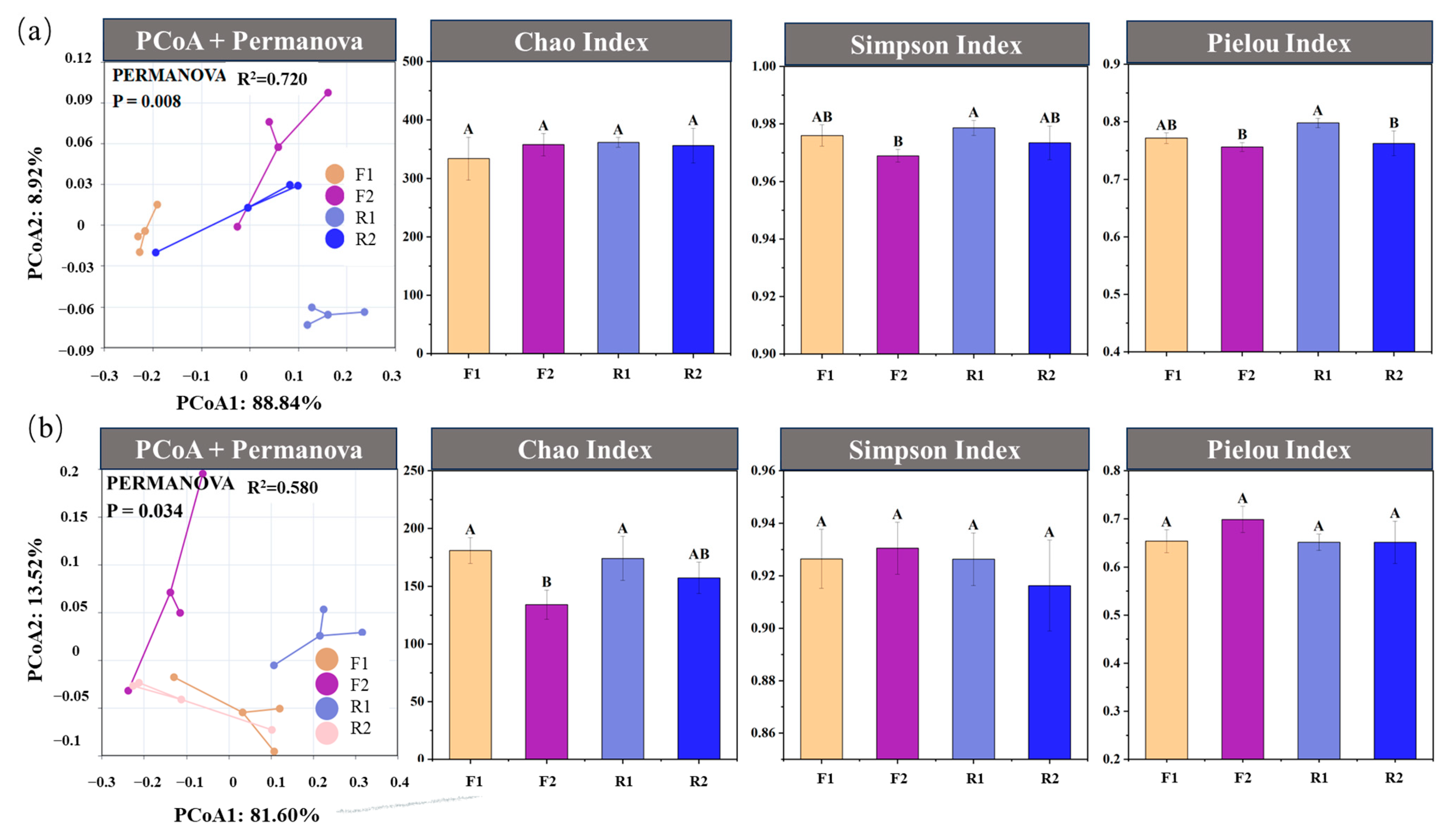 - Wang, P.; Pang, S.; Xu, M.; Liu, W.; Zhang, Z.; Ji, B.; Zhang, X. Disturbances Consistently Restrain the Role of Random Migration in Grassland Soil Microbial Community Assembly. Global Ecol. Conserv. 2021, 26, e01452. [Google Scholar] [CrossRef]