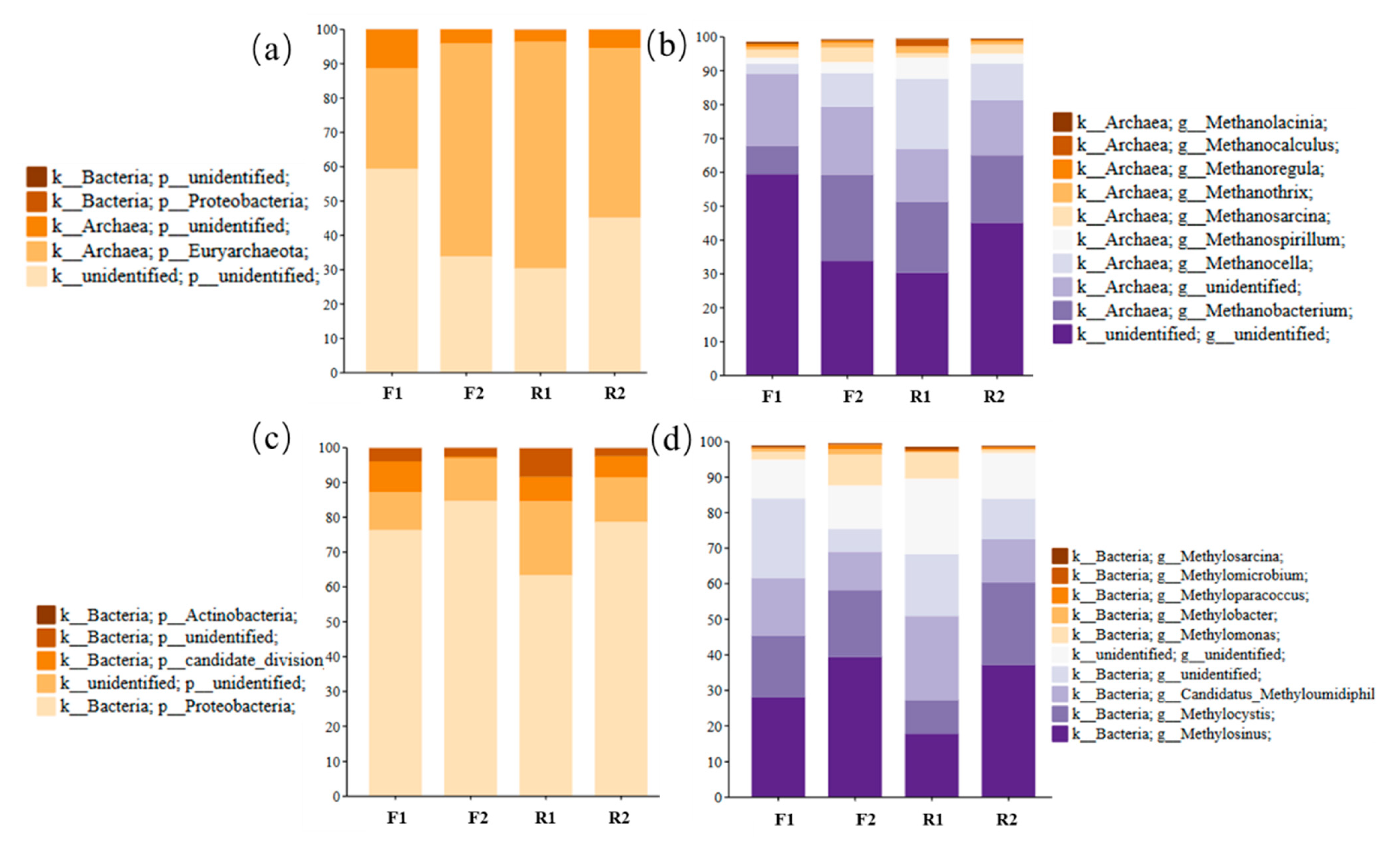 - Wu, D.; Zhao, C.; Bai, H.; Feng, F.; Sui, X.; Sun, G. Characteristics and Metabolic Patterns of Soil Methanogenic Archaea Communities in the High-latitude Natural Forested Wetlands of China. Ecol. Evol. 2021, 11, 10396–10408. [Google Scholar] [CrossRef]