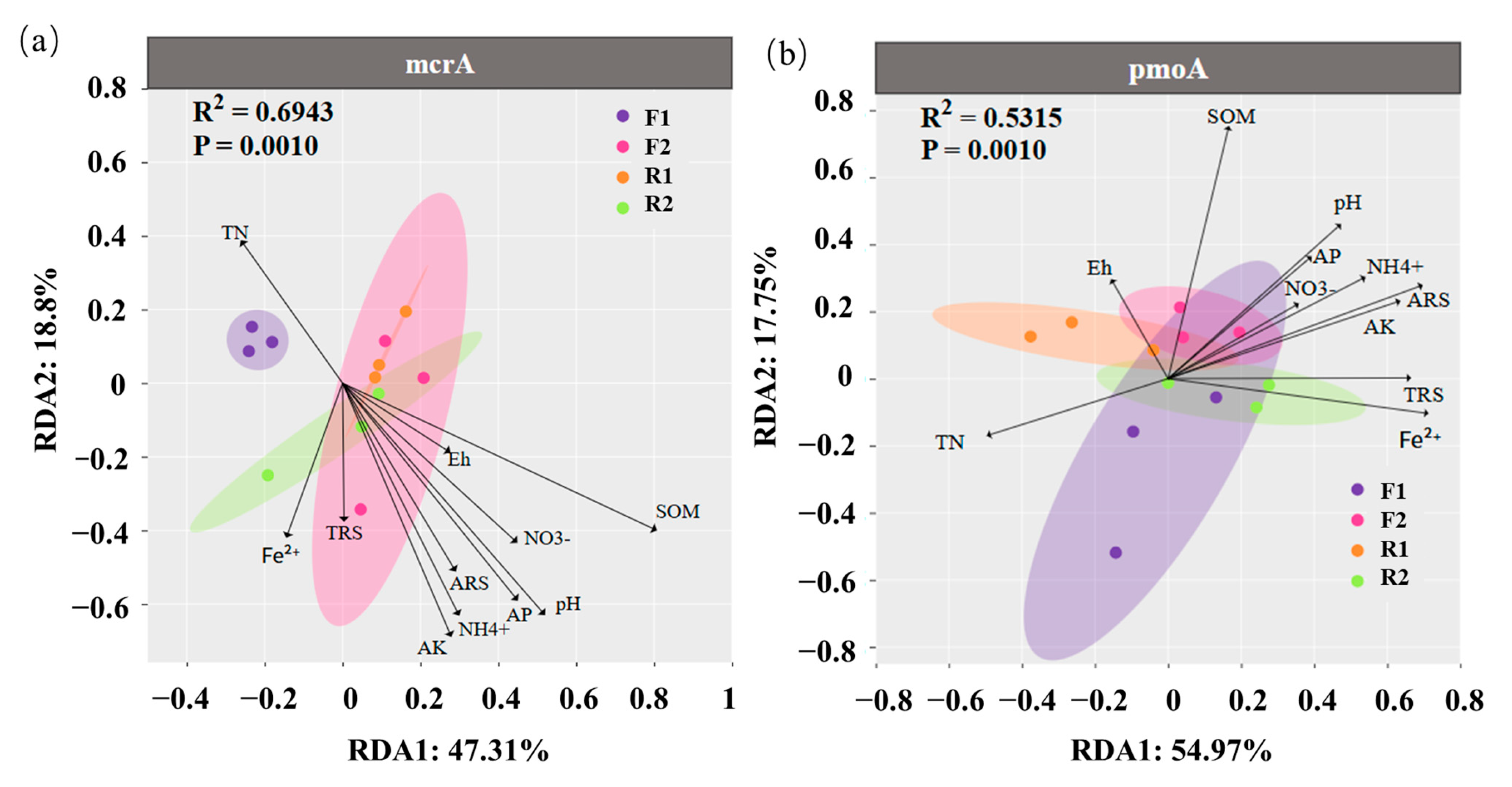 3.3. Effects of Different Tillage Practices and Rotation Systems on the Diversity of Methanogenic and Methanotrophic Functional Communities in Paddy Soils