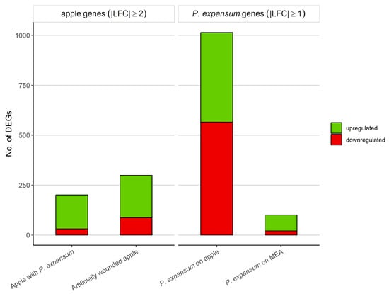 Afterwards, the expression of common apple DEGs was derived as the difference between the log2 fold change values (ΔLFC) of comparison 1 (artificially wounded apple) and those of comparison 2 (inoculated apple). For common P. expansum DEGs, the expression was derived as the difference between the LFC values (ΔLFC) of comparison 3 (P. expansum on MEA) and those of comparison 2 (P. expansum on apple). In both cases, the difference was considered significant if the absolute value was ≥2.