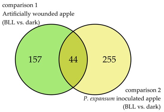 The Venn diagram shows 157 unique DEGs from comparison 1 (artificially wounded apple; BLL vs. dark), 255 unique DEGs from comparison 2 (inoculated apple; BLL vs. dark), and 44 common DEGs.