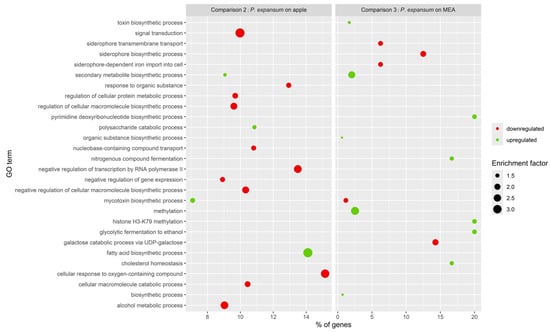 Gene ontology enrichment analysis was performed on the sets of unique DEGs from comparisons 2 and 3 (Figure 7). In response to P. expansum grown on apples exposed to BLL compared to P. expansum grown on apples kept in the dark (comparison 2), we identified 79 enriched biological processes, of which 50 were downregulated and 29 were upregulated (Table S6). However, in response to BLL, P. expansum grown on MEA (comparison 3) showed 26 enriched biological processes, of which 5 were downregulated and 21 were upregulated (Table S8). In response to BLL irradiation, P. expansum exhibited condition-specific enrichment of GO biological process terms, as shown in the bubble plot comparing samples grown on apples (P. expansum on apple) and on MEA (P. expansum on MEA). We identified a higher number of downregulated biological processes when P. expansum was exposed to BLL and grown on apples (50 biological processes) compared to samples from MEA, the former showing downregulation of genes involved in signal transduction, response to organic substances, regulation of metabolic and biosynthetic processes, and negative regulation of transcription. Enriched terms among the upregulated genes included the secondary metabolite biosynthetic process, which was also upregulated in P. expansum grown on MEA and exposed to BLL, and the mycotoxin biosynthetic process, for which we observed downregulation in P. expansum exposed to BLL and grown on MEA. In P. expansum exposed to BLL while growing on MEA (comparison 3), we identified that most of the upregulated genes are involved in enriched biological processes related to methylation, fermentation, and cholesterol homeostasis, and downregulated genes are involved in the enriched processes of siderophore transport and biosynthesis.