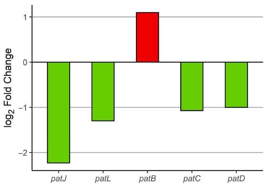 During the investigation of the irradiation effect of BLL on the expression of genes from the patulin cluster (patA–patO) in P. expansum grown on apples (comparison 2), we found five genes from the patulin cluster to be differentially expressed (Figure 8). Only one of these genes (patB) was upregulated, while the rest among them (patJ, patL, patC, and patD) were downregulated. This finding indicates reduced pathogenicity of P. expansum on apples with respect to patulin biosynthesis as a consequence of BLL irradiation. There was no statistical difference in the expression of genes from the patulin cluster in comparison 3 (Table S9). The inference of reduced patulin production is indirect, based on transcriptomic data rather than chemical quantification.