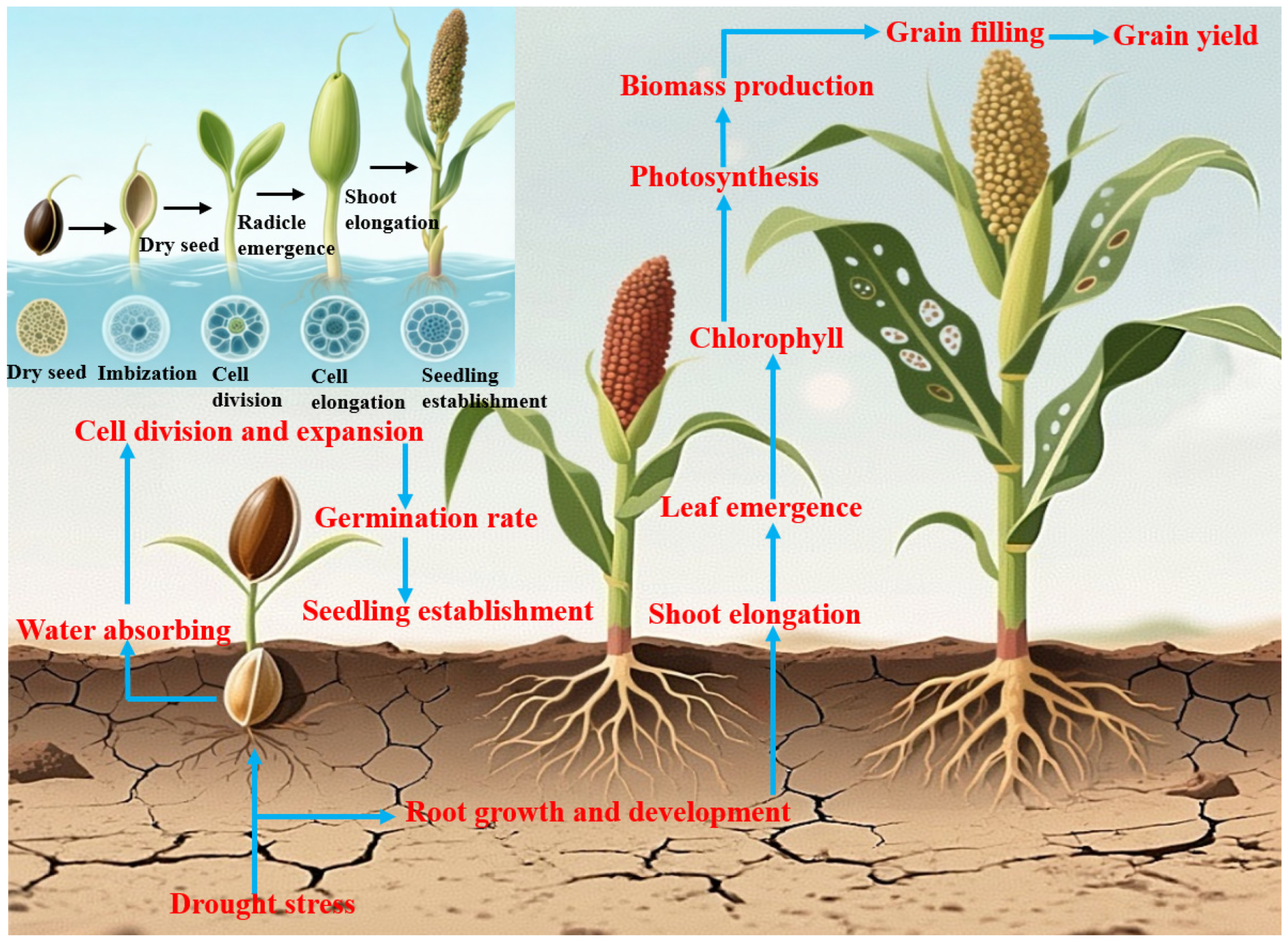 - Queiroz, M.S.; Oliveira, C.E.; Steiner, F.; Zuffo, A.M.; Zoz, T.; Vendruscolo, E.P.; Silva, M.V.; Mello, B.F.F.R.; Cabral, R.C.; Menis, F.T. Drought stresses on seed germination and early growth of maize and sorghum. J. Agric. Sci. 2019, 11, 310–318. [Google Scholar] [CrossRef]