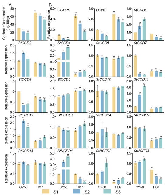 qRT-PCR expression analysis of StCCD genes in different stages of CY50 and HS7. (A) The content of carotenoids. (B) Expression levels of carotenoids-related genes. Actin was chosen as a negative control. Data are presented as mean ± SD (n = 3); * and ** indicate significant differences (p < 0.05 and p < 0.01), One-way ANOVA along with LSD multiple comparison test.